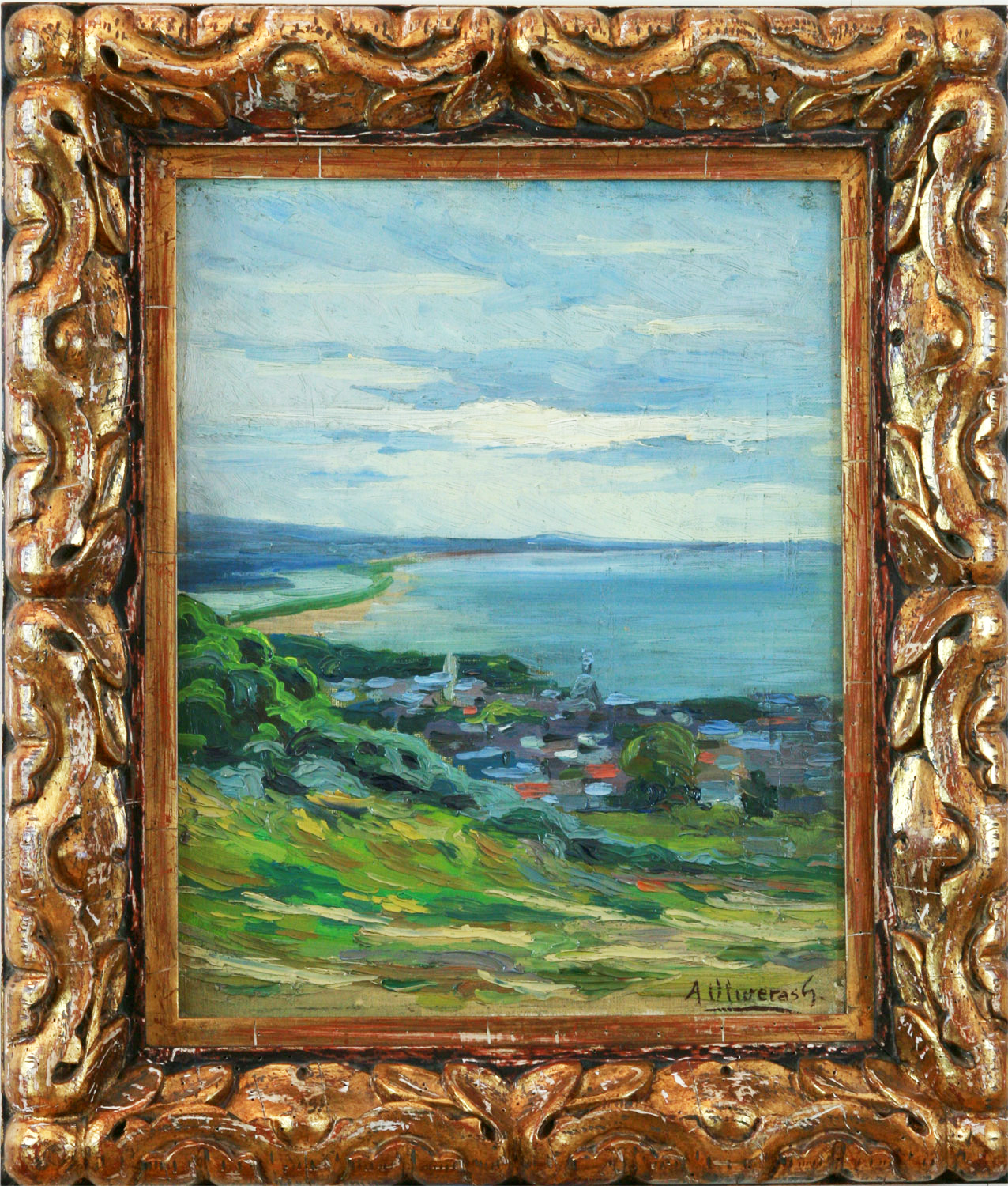 OLIVERAS GUART, Angel - Barcelona, 1889 – 1990 - Siguió la carrera consular, que pronto abandonó para dedicarse exclusivamente a la práctica de la pintura. Trasladóse a Madrid para estudiar en la Escuela Superior de Bellas Artes a fin de obtener el título de profesor, y allí recibió lecciones de los maestros Sorolla, Muñoz Degrain, Romero de Torres y otros. Viajó posteriormente por Europa, residiendo durante algunos años en París donde fue discípulo de Paul Chavas, Asier, y otros renombrados pintores. Dedicóse básicamente al paisaje, siendo considerado un gran paisajista. En la Exposición Internacional celebrada en Burdeos, sus obras fueron distinguidas por el Gran Diploma de Honor. En París y en Madrid, fue premiado con sendas Medallas de Plata. En 1926, expuso en Barcelona, en las Galerías Areñas, un conjunto de paisajes con gran éxito, de los cuales expresó todo el encanto de las ruralias francesas. Apasionado por el Greco, fue a establecerse en Toledo, donde, a su iniciativa se debe la creación del Arte Moderno Toledano. También se le debe, la creación de la Escuela de Artes y Oficios de Tárrega que organizó y dirigió algún tiempo. Gran enamorado de Aranjuez, pasaba sus temporadas de vacaciones allí, y cuyos famosos jardines pintó en varias ocasiones, destacando de entre sus telas allí realizadas: “Día Gris”, “Contraluz”, “En Otoño”, “Sol de tarde” etc. Sus exposiciones individuales fueron muchas, y siempre distinguidas por la crítica y el público. Colaboró en diversas revistas españolas y extranjeras, y escribió entre otras obras “Toledo y el Greco”. En 1927, fue nombrado académico de Bellas Artes y de Ciencias Históricas. Cuadros suyos que deben destacarse, son:”Ángelus “Toledo, “Diana Cazadora”, “Moret sur Ling” Moret, “Patio del Conde” Toledo, “Contraluz” Versalles, etc. Obras suyas figuran en los Museos de Arte Moderno de Barcelona y de Madrid, del Luxemburgo, de París, y en la Academia de Bellas Artes de Toledo. Decir finalmente, que muy poca obra de Oliveras Guart podemos encontrar en el mercado del arte, ya sea Galerías o Subastas puesto que, puede considerarse, que la mayor parte de su obra, reside, guardada entre las muchas colecciones particulares, españolas y francesas.