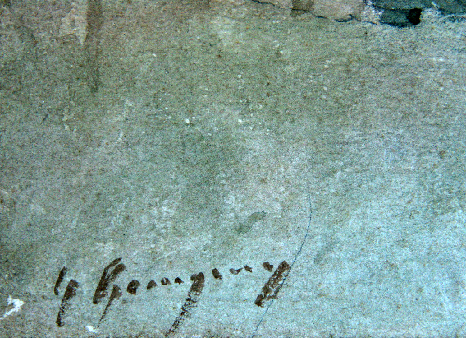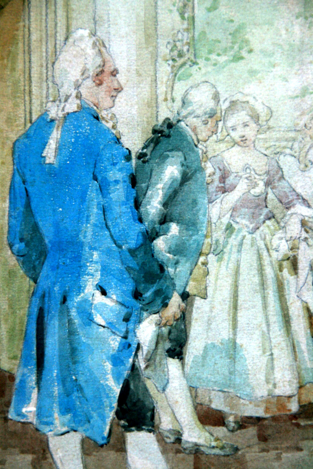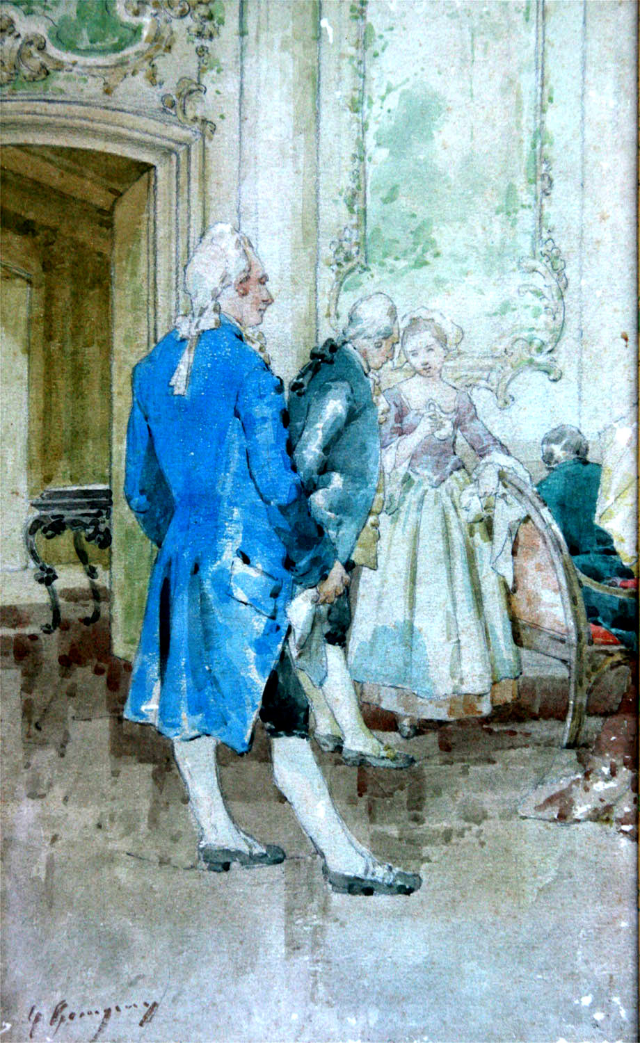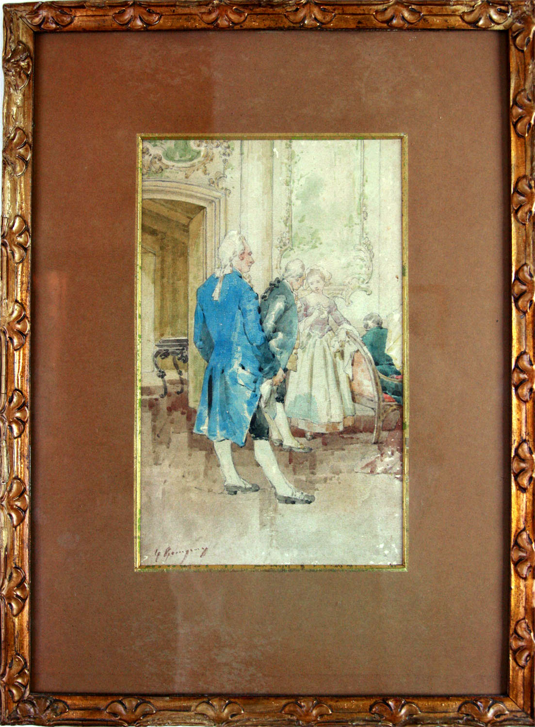 ESCUELA FRANCESA SIGLO XIX - Asistimos en ésta obra, a una escena de cortejo y galantería, donde se establece un entorno claramente rico y delimitado, bajo unas rígidas normas que establecen los temas a tratar entre los personajes El autor, logra captar el momento con gran verismo, a través de una composición detenidamente estudiada, mediante tonos de azules acuarelados y diluidos siendo de una excelencia en el dibujo preciso y marcado. Nos representa el autor un escenario con enorme realismo, prestando gran atención a todos los pequeños detalles anecdóticos. Esta fidelidad representativa, tan propia del Siglo XIX, se pone en este caso al servicio del autor, para permitirle implicar al espectador de manera directa en al centro de la escena.