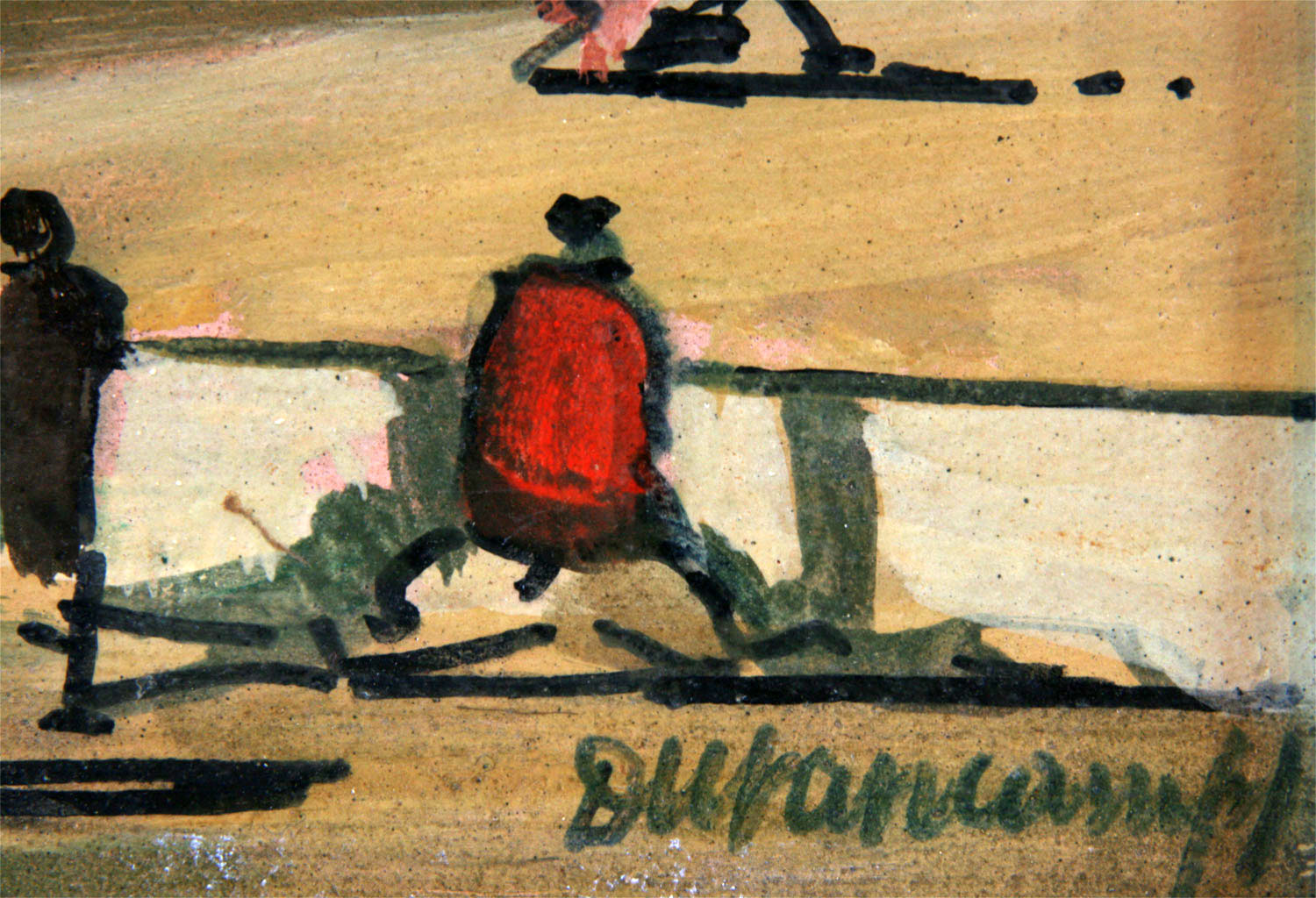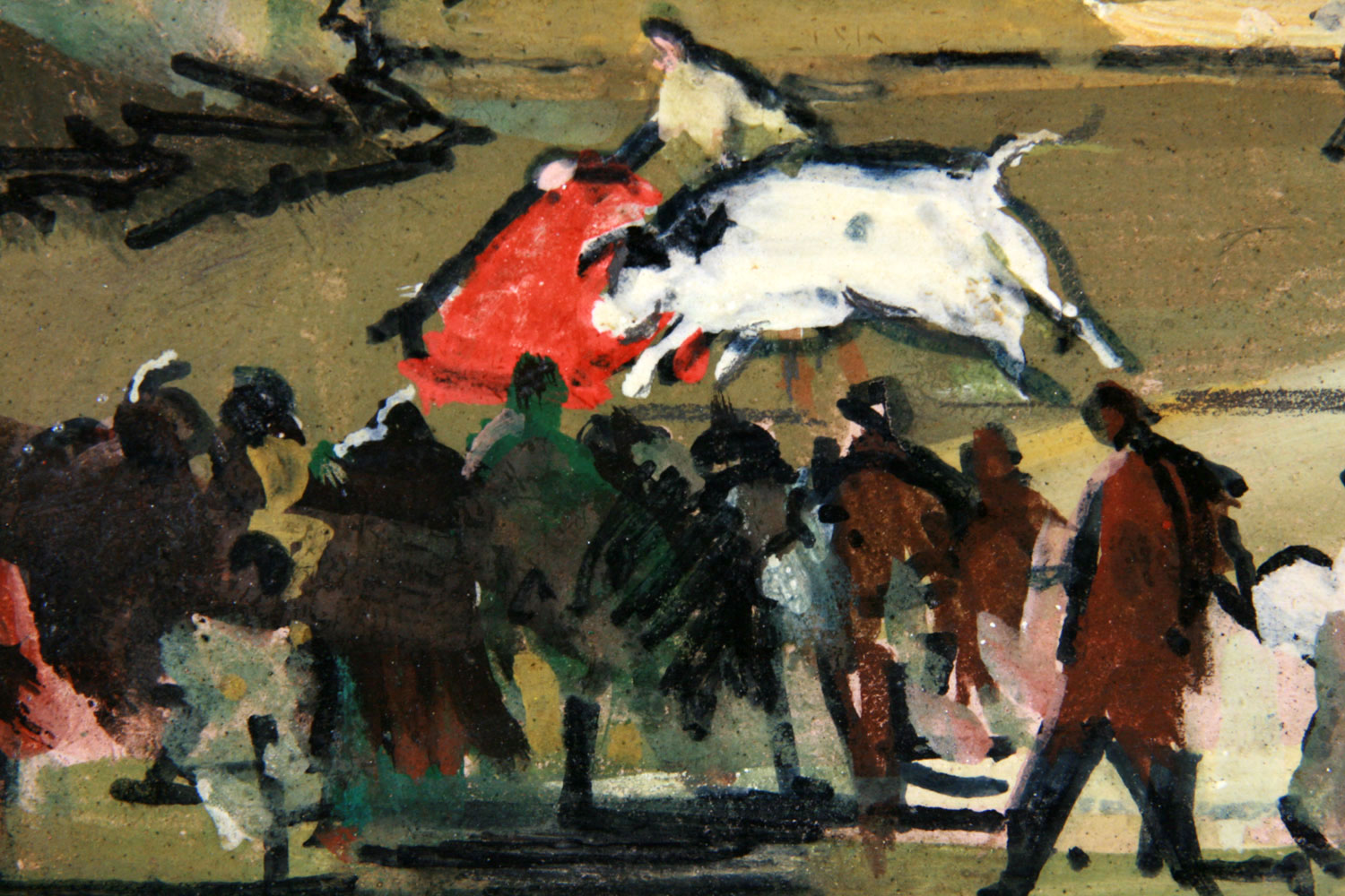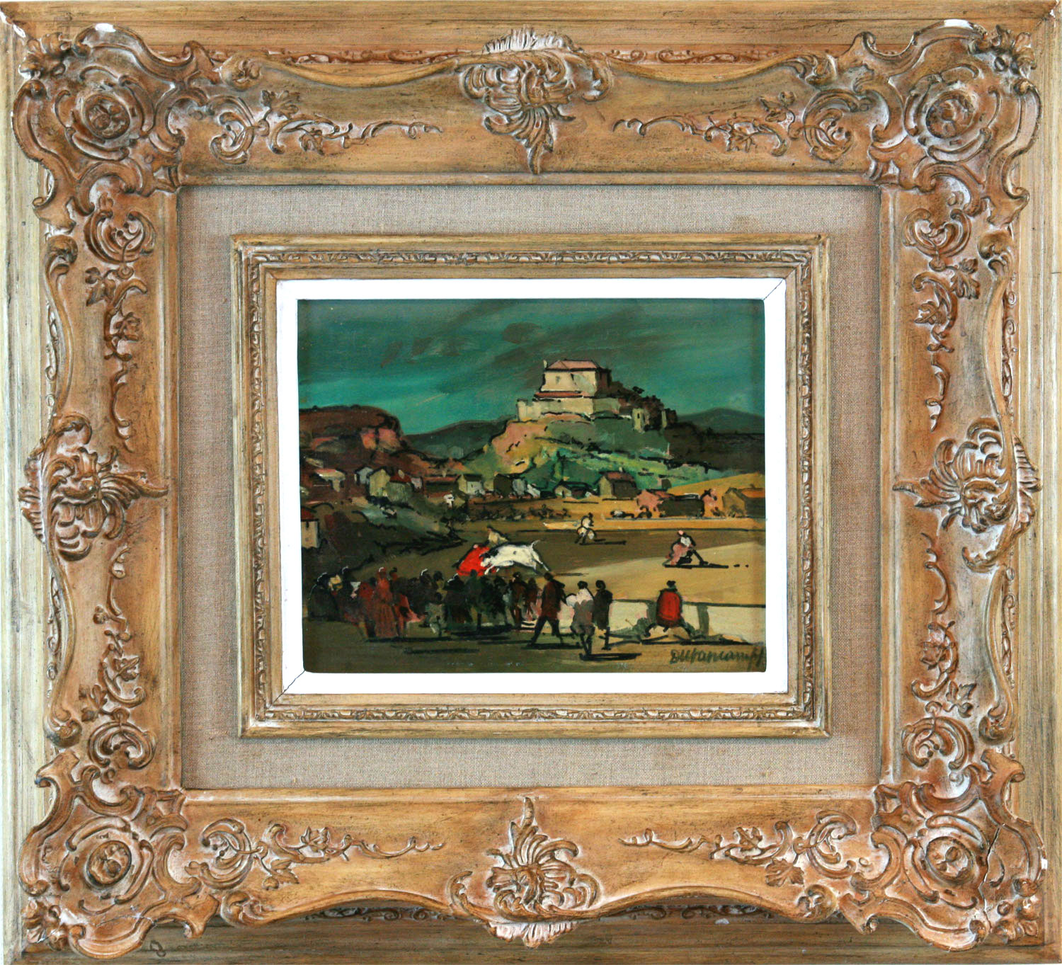 DURANCAMPS FOLGUERA , Rafael - Sabadell 1891 – Barcelona 1979 - Hijo de industrial, decidió dedicarse a la pintura pese a la oposición de su familia. Se formó junto a Vila Cinca y fue discípulo de Joaquin Mir cuya influencia se aprecia claramente en su primera etapa. Sobre 1915 comienza a presentar su obra en Sabadell y dos años más tarde expone de forma individual en Barcelona. A partir e aquí realizó sucesivas exposiciones en Madrid, Bilbao, Valencia, San Sebastián, Filadelfia, Londres Buenos Aires y París, donde en 1939 inaugura su propia galería con el nombre de “ La Fenétre Ouverte “ . En Barcelona se dio a conocer definitivamente, a través de un ciclo de exposiciones en la Sala Pares, que se celebraron regularmente y sin interrupción hasta su fallecimiento. En 1980 celebró la misma sala una exposición- homenaje a título póstumo con obras de todas sus épocas. Durancamps, alcanzó en vida un considerable reconocimiento, no sólo en nuestro país sino también en París y en múltiples países europeos y americanos. En el transcurso de su vida, su obra fue evolucionando, y sus cuadros abandonaron la exaltación cromática heredada de Joaquin Mir para sumergirse en una pintura más estructurada, de mayor intención formal y dibujística, influida quizás por los maestros del Prado como Goya, Velásquez, Zurbarán y E. Lucas. Cultivó temas muy diversos, aunque prefería el paisaje el bodegón y sobre todo las escenas taurinas o capeas; estas últimas asumieron el papel de leit-motiv en la obra de Durancamps. Obras suyas figuran en diversos museos europeos y colecciones particulares de todo el mundo.