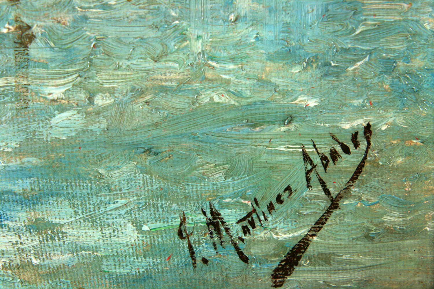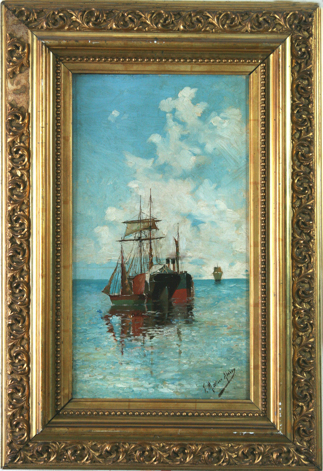 MARTINEZ ABADES, Juan - Gijón (Asturias) 1862 – Madrid 1920 – Gran parte de su obra la componen marinas, escenas portuarias y representaciones naturalistas del paisaje costero de la cornisa cantábrica, además de otras de estilo costumbrista. Hijo de un industrial gijonés, comenzó a mostrar sus cualidades artísticas ya en el Instituto Jovellanos de su ciudad natal, copiando dibujos de la colección reunida por Dn. Gaspar. Más tarde, ya en Madrid, se formó en la Escuela Especial de Pintura, Escultura y Grabado entre los años 1880 y 1887. Entre sus maestros estuvieron el escultor José Gragera y los pintores Ignacio Suárez Llanos y Carlos de Haes. Entre sus compañeros de «plein-air» en Asturias, Manuel Ramos Artal. Participó por primera vez en la Exposición Nacional de Bellas Artes con un lienzo de tema histórico, La muerte de Mesalina. Tras estar pensionado en Italia por la Diputación de Oviedo, se presentó a la Nacional de 1890 consiguiendo una Segunda Medalla por El viático a bordo (Museo de San Telmo, San Sebastián), premio que volvió a recibir dos años después por “El entierro de un piloto” (colección Masaveu, Oviedo). Respaldado por su paisano y protector Florencio Valdés, el pintor desarrolló en el Madrid de la Restauración una intensa actividad social. Además de participar en todas las exposiciones nacionales entre 1884 y 1917, se reveló como un popular cupletista. A partir de 1894 y hasta su muerte, fue uno de los ilustradores gráficos más asiduos en la etapa inicial de la revista "Blanco y Negro". Además de en la capital española, expuso en las Exposiciones Universales de Barcelona (1888) y Chicago (1893), y en La Habana (1914). Su matrimonio en 1891 con una canaria, Aurora Moreno Caubín, le llevaría en 1906 a decorar el Salón de Actos del Ayuntamiento de Santa Cruz de Tenerife. Tanto en vida del artista como después de su muerte y aún con el paso del tiempo, la figura de Martínez Abades se reconoce por su producción marinista. Su obra, abundante y desigual, abarcó todos los temas relacionados con el mar: las escenas portuarias o de rías, las estampas navales de viejos veleros y 'modernos' buques de la Armada Real, los cuadros costumbristas o playeros, o las vistas naturalistas, tanto de interés geológico como episodios de crítica social. Pintó preferentemente las costas del Mar Cantábrico y de la Galicia atlántica, con un innovador apéndice canario y caribeño. En 1987, el Museo de Bellas Artes de Asturias organizó una muestra homenaje que recorrió varias ciudades españolas.