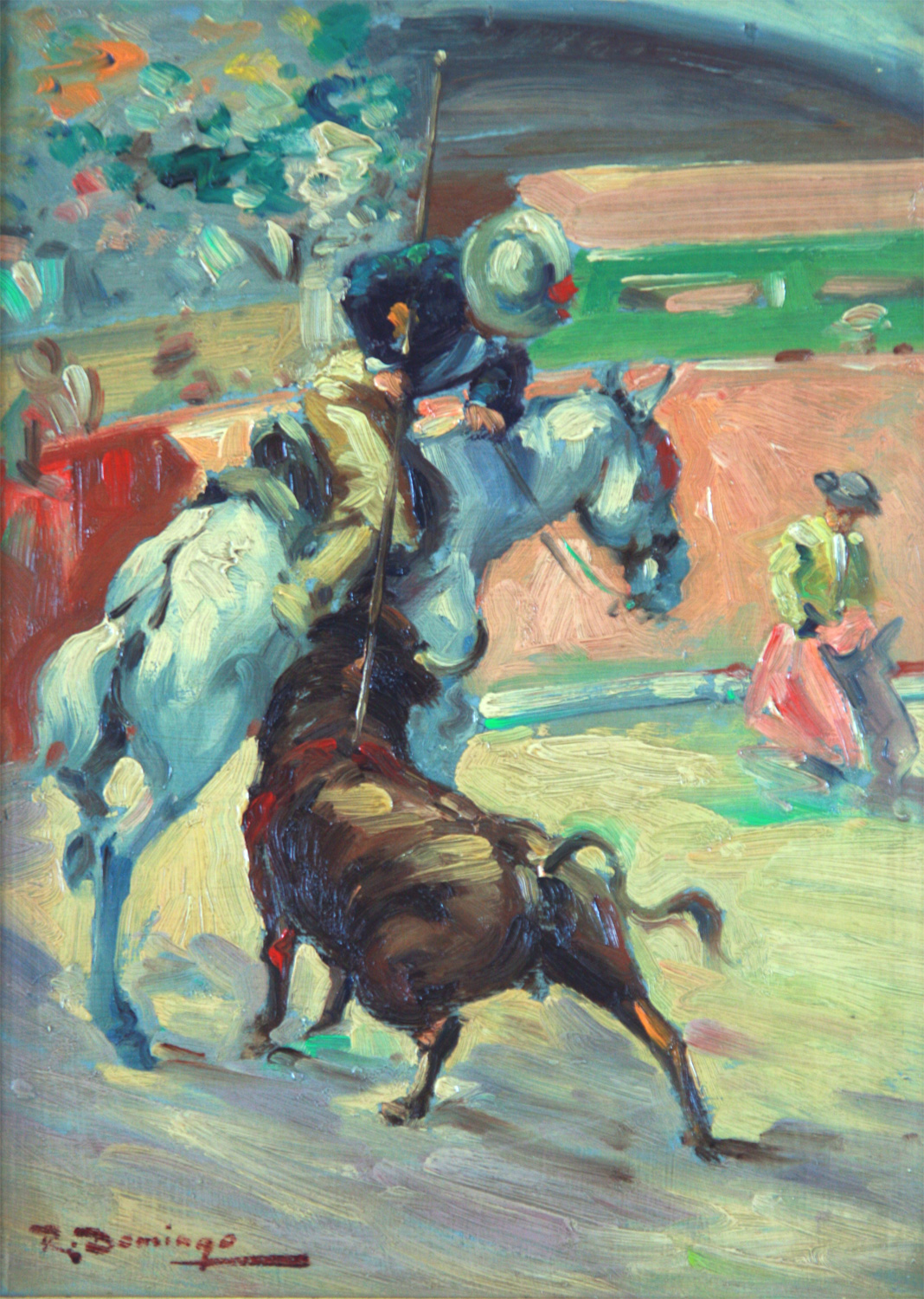 DOMINGO FALLOLA, Roberto París – 1883 – Madrid 1956 - Hijo del pintor Francisco Domingo Marqués. Su hogar, fue la prolongación del estudio paterno, constantemente visitado por marchantes y coleccionistas hasta definir un ambiente que moldeó su temperamento artístico, A los cinco años ya dibujaba siguiendo los consejos y orientaciones de su padre, que le animó a conservar los dibujos en un álbum que luego hizo historia. Estudió dos años en el Liceo Carnot, y allí ganó un premio de dibujo. En París tuvo ocasión de familiarizarse con la obra de Manet, Monet, Sisley, Degás y otros. Con apenas dieciséis años, comenzó a vender sus cuadros, preferentemente marinas carreras de caballos y escenas de toros, a los clientes de su padre. En 1906 se instala en Madrid asistiendo a las clases de Muñoz Degrain en la academia de San Fernando, donde estuvo poco tiempo; para entonces, Roberto Domingo ya ha tenido oportunidad de asombrarse con la magia del espectáculo taurino y en 1908 acude a la Nacional de Bellas Artes con una Suerte de Varas pintado al gouache con el que resulta premiado con tercera medalla. Este mismo año celebra una exposición individual con un total de 51 obras, en los locales del mueblista José Suárez, con sede en la Carrera de San Jerónimo y hace ventas por valor de veinte mil pesetas; la crítica resulta unánime en considerar que su retina exacta como una máquina fotográfica, recoge la realidad jugosa y viva que el ojo humano lleva al objetivo poetizándolo e impregnándolo todo de belleza y movimiento. En 1910 presenta 75 obras en los almacenes de alfombras propiedad de Joaquín Menchero donde tiene gran éxito y vende toda su obra. En 1912 acude a la Sala Parés de Barcelona con ocho guaches magistrales según elogios de la prensa y la crítica. En 1917 expone en las célebres Galerías Tooh de Londres alcanzando una venta superior a las ochenta mil pesetas y éste mismo año celebra exposiciones en Barcelona, Bilbao, San Sebastián y Munich generalmente utilizando el gouache para los temas taurinos del que logra sacar entonaciones armónicas de gran belleza de colorido y un movimiento vivo de nuestro espectáculo nacional. Mientras tanto, amigos y admiradores compran sus cuadros en su propio taller, lo que determina que pueda celebrar contadas exposiciones. El auge de las subastas comerciales, a propiciado la aparición de numerosas obras firmadas por Roberto Domingo. Su técnica se aproxima a la utilizada por los impresionistas y presenta una cierta debilidad en el dibujo. Hacia los años 20 el pintor, simplifica líneas y diluye la policromía de los tonos. A partir de 1939 Roberto se muestra personalísimo en el empleo de la luz; la fidelidad al gouache se justifica como medio preciso para obtener el resultado apetecido. También la firma sufre variaciones en orden a las distintas etapas, y en cierto modo, sirve de guía para catalogar su obra “R. Domingo ó “Robert Domingo y en 1918 comienza a firmar con letras mayúsculas nombre y apellido. Rara vez tomaba apuntes del natural y pintaba de memoria, incluso transcurridos meses de la visión.