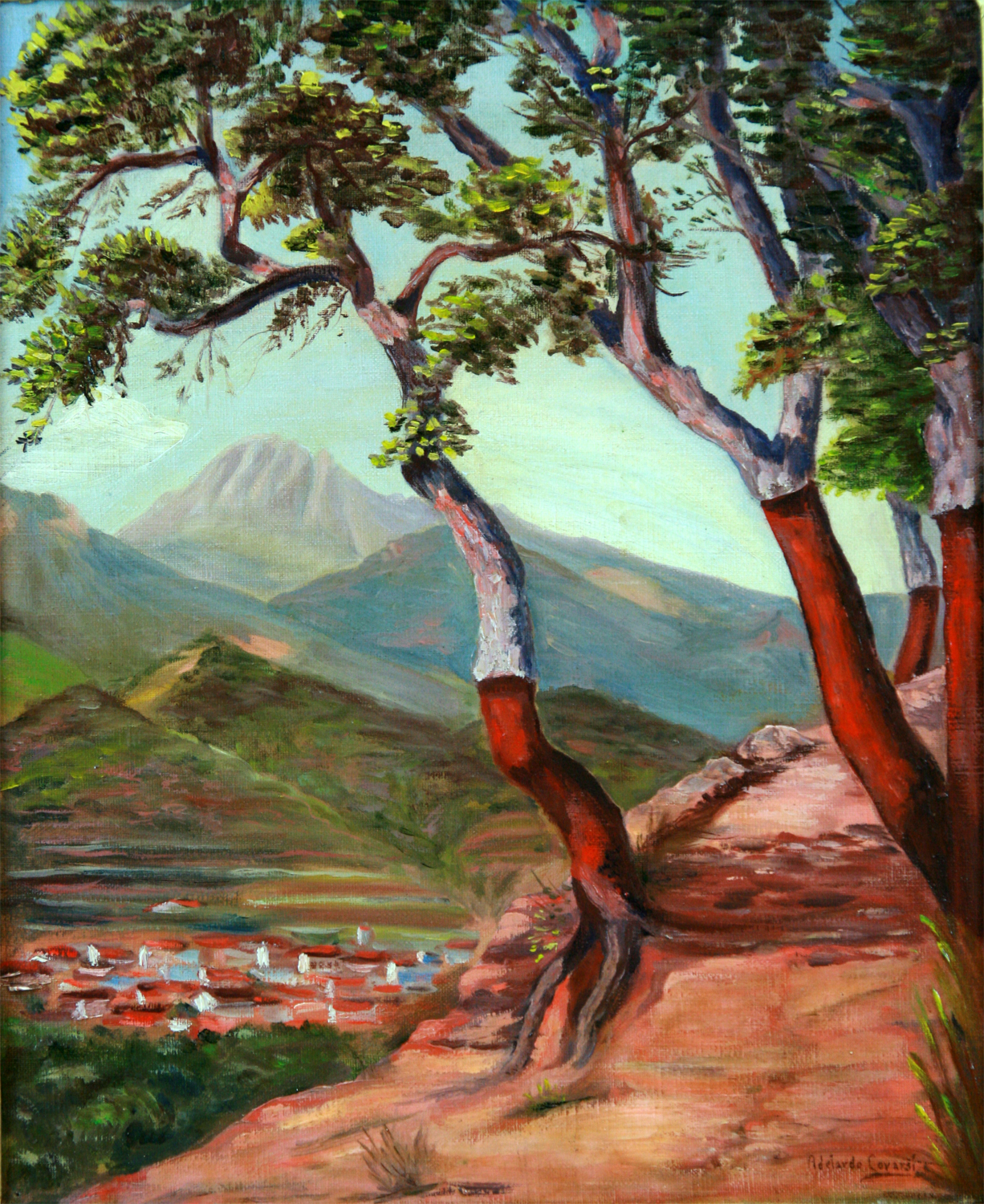 COVARSÍ YUSTAS, Adelardo – Badajoz 1885 – 1951 - Fue un reconocido pintor de la tierra extremeña cuya obra pictórica se caracteriza fundamentalmente por composiciones cinegéticas de ahí que en muchas ocasiones se le haya calificado como el pintor de los cazadores extremeños. Pintura de depurada técnica y marcados contenidos costumbristas, rurales, monterías y bellos paisajes extremeños, no en vano su padre, además de comprometido coleccionista de arte era un cazador de prestigio en Extremadura. Desde muy temprana edad su afán por la pintura ya se manifestaba como lo que sería su gran pasión y vocación. Por su parte, su familia le apoyaba en su gusto por el arte. Así su formación comenzó siendo discípulo de Felipe Checa. Es a partir del año 1903 cuando continúa con sus estudios en la Escuela Especial de Pintura, Escultura y Dibujo de San Fernando de Madrid. Conocidos asimismo son sus viajes por Italia, Portugal, Países Bajos, Gran Bretaña y Francia lo que le depararía un cercano conocimiento de las grandes obras de otros autores. Resultado de uno de sus viajes, concretamente el que realizo a Italia, es su libro Italia, impresiones de viaje por un pintor. Tras sus viajes, en 1907 volvió a su ciudad natal para ejercer su nueva profesión haciéndose cargo de la plaza de profesor de dibujo en la Escuela de Artes y Oficios de la ciudad de Badajoz, escuela que con los años llegaría a dirigir. Su labor como docente no era sin embargo un obstáculo para que su producción disminuyese, si bien al contrario, era muy habitual ver sus obras colgadas en muchas de las exposiciones nacionales que tenían lugar por aquellos años. No es de extrañar que, en este sentido, en el año 1948 fuese galardonado su trabajo con una merecida Medalla de Honor en reconocimiento a su producción. Fue también presidente del Museo Provincia de Arte de Badajoz allá por el año 1922 lo que le facilitó el hecho de poder proteger el inconmensurable patrimonio histórico y artístico de Extremadura para aquel entonces. Además ostentó el cargo de director local del Patronato de Turismo así como el de miembro de la Junta de Monumentos de Extremadura. Pinturas de marcado estilo impresionista y costumbrista, realismo y gusto por la naturaleza, los paisajes otoñales, colores cálidos de las nubes y los cielos, las dehesas extremeñas y los bellos atardeceres de son algunos de los rasgos más distintivos de sus cuadros. Sus buenas amistades con importantes personajes del momento, le granjearon la posibilidad de hacer numerosos retratos en los que marcan la pauta los colore sobrios así como un estilo inconfundible. Entre las muchas distinciones que obtuvo a lo largo de su carrera por su trabajo, cabe destacar la mención honorífica de la Exposición Nacional de Bellas Artes, concedida en Madrid en 1906 por su cuadro Atalayando, la medalla de oro de la Exposición Iberoamericana de Sevilla de 1929 por En la raya de Portugal o la primera medalla en la Exposición Nacional de Bellas Artes de Madrid en el año 1949 por El montero de Alpotreque, obra que en la actualidad se encuentra expuesta en el Museo de Bellas Artes de Badajoz.En 1947 fue nombrado hijo predilecto de la ciudad de Badajoz.