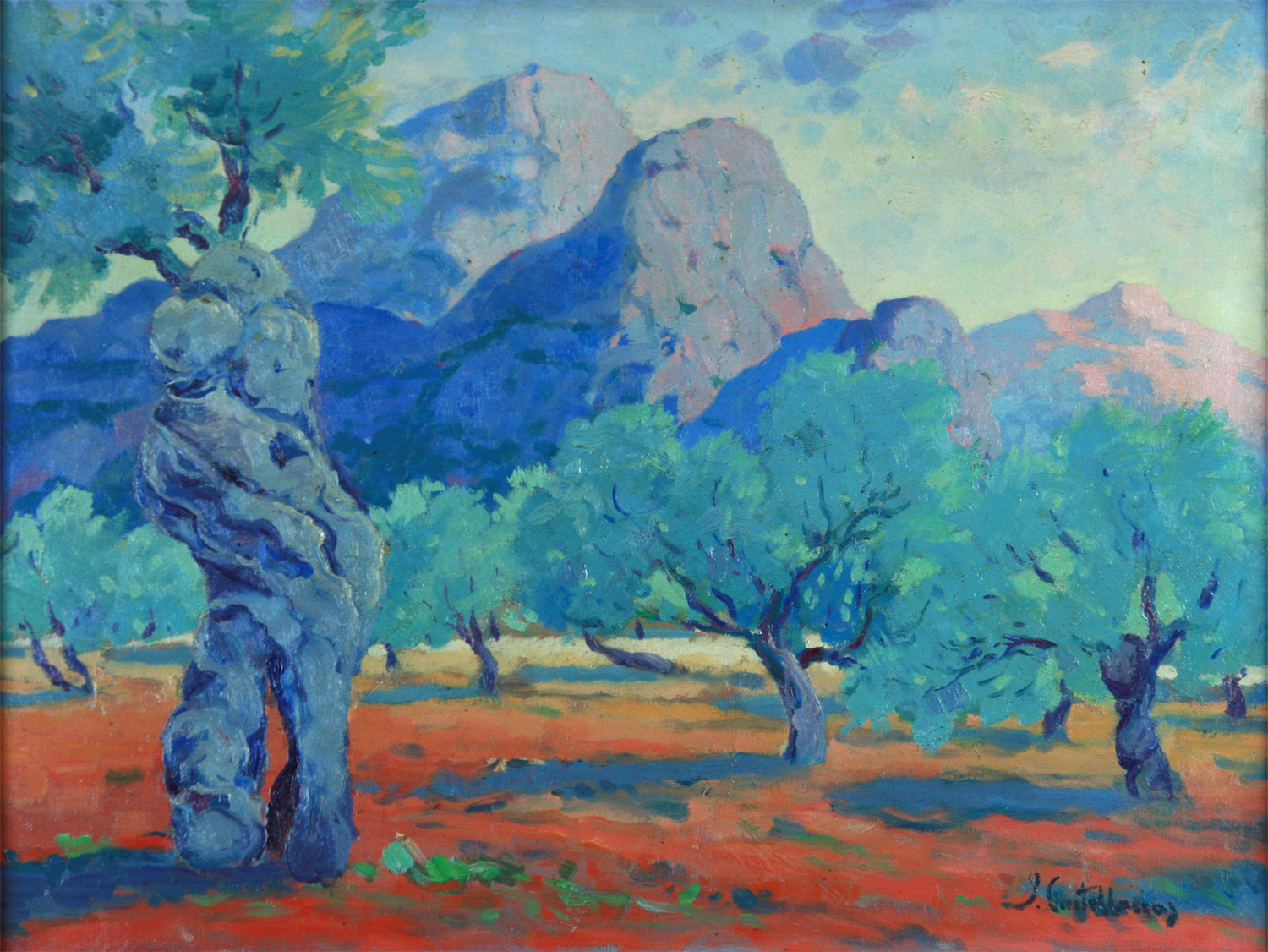CASTELLANAS GARRICH , José – Barcelona, 1896 – Palma de Mallorca 1980 - Fue discípulo de Santiago Rusiñol, con el que viajó a Mallorca por primera vez. En 1919, pintó paisajes de Soller, Valldemosa y Manacor, que expuso con paisajes catalanes y bodegones en las Galerías Layetanas de Barcelona, el año 1921, muestra que fue su segunda individual y tuvo gran éxito de la crítica que destacó especialmente las telas mallorquinas que se vendieron el primer dia de la exposición. A partir de aquel año, y hasta 1940 en que se instaló definitivamente en la isla, alternó su residencia entre Barcelona y Mallorca con diferentes estancias en Francia y México. A lo largo de los años veinte y treinta celebró numerosas exposiciones en Barcelona , Madrid, México y otras ciudades en las que siempre presentó paisajes de Mallorca. En 1940, fija definitivamente su residencia en Deià (Mallorca) e hizo su primera individual en Palma en las Galerías Costa. A partir de entonces expondrá regularmente en las mencionadas galerías, además e Meliá y Dera. Cabe también destacar sus exposiciones en las Galerias Mora de Sóller, municipio donde vivió desde 1960. Expuso también en Alger en 1959 y en San Sebastián 1964. Formado en los ambientes modernistas catalanes, Castellanas, se dedicó especialmente al paisaje de la costa y parajes de la sierra mallorquina (Valdemosa, Deiá , Sóller, Fornalutx, y Biniaraix). Su pintura, participa del culto a la forma propio de los modernistas y de la conquista de la luz herencia de los impresionistas. En sus telas, notamos la presencia de un artista consciente que ha sabido conjugar la fuerza de un paisaje con un culto a las formas que son en él consustanciales. La obra de José Castellanas señala un momento en la interpretación del paisaje deyanense tanto por lo que tiene de captación como por lo que tiene de ambientación y espíritu. Crítico con la pintura de vanguardia, se mantuvo siempre fiel a los postulados modernistas, evolucionando hacia un cierto post-impresionismo, hasta los últimos decenios de su larga vida.