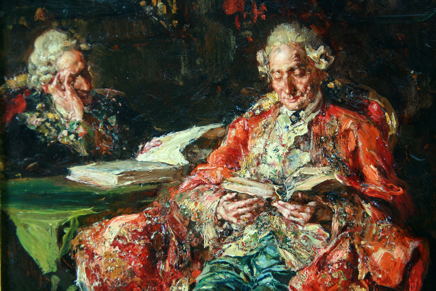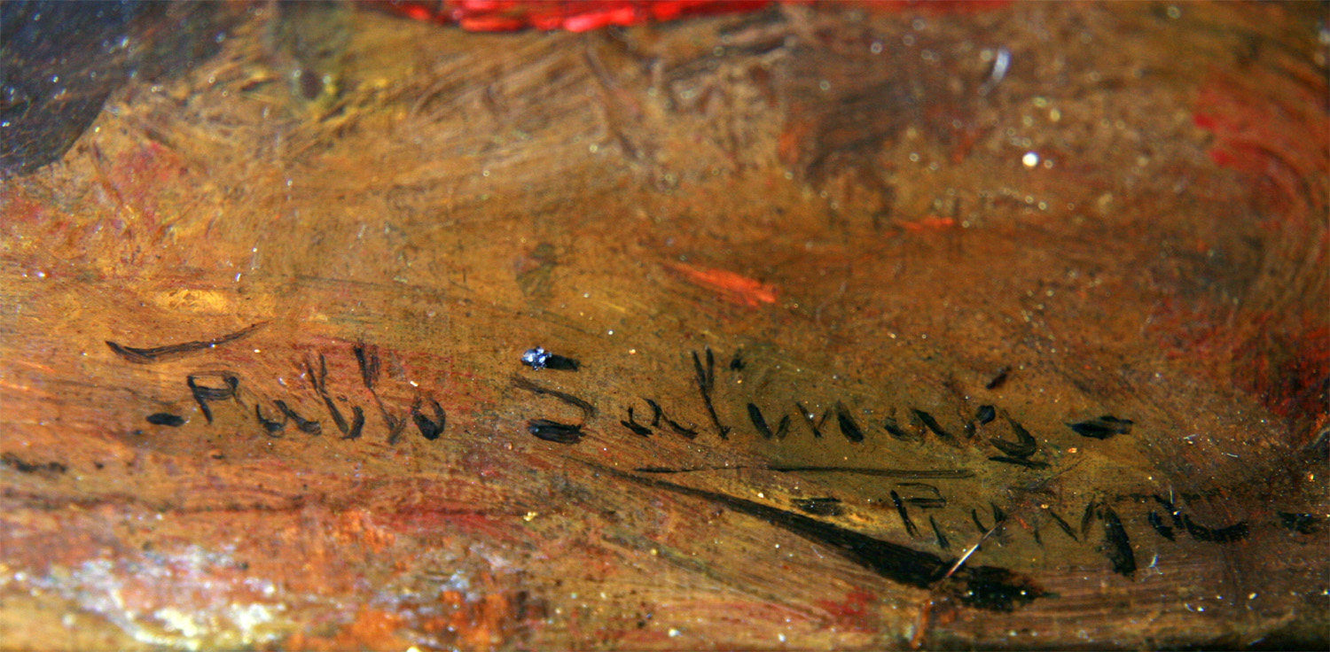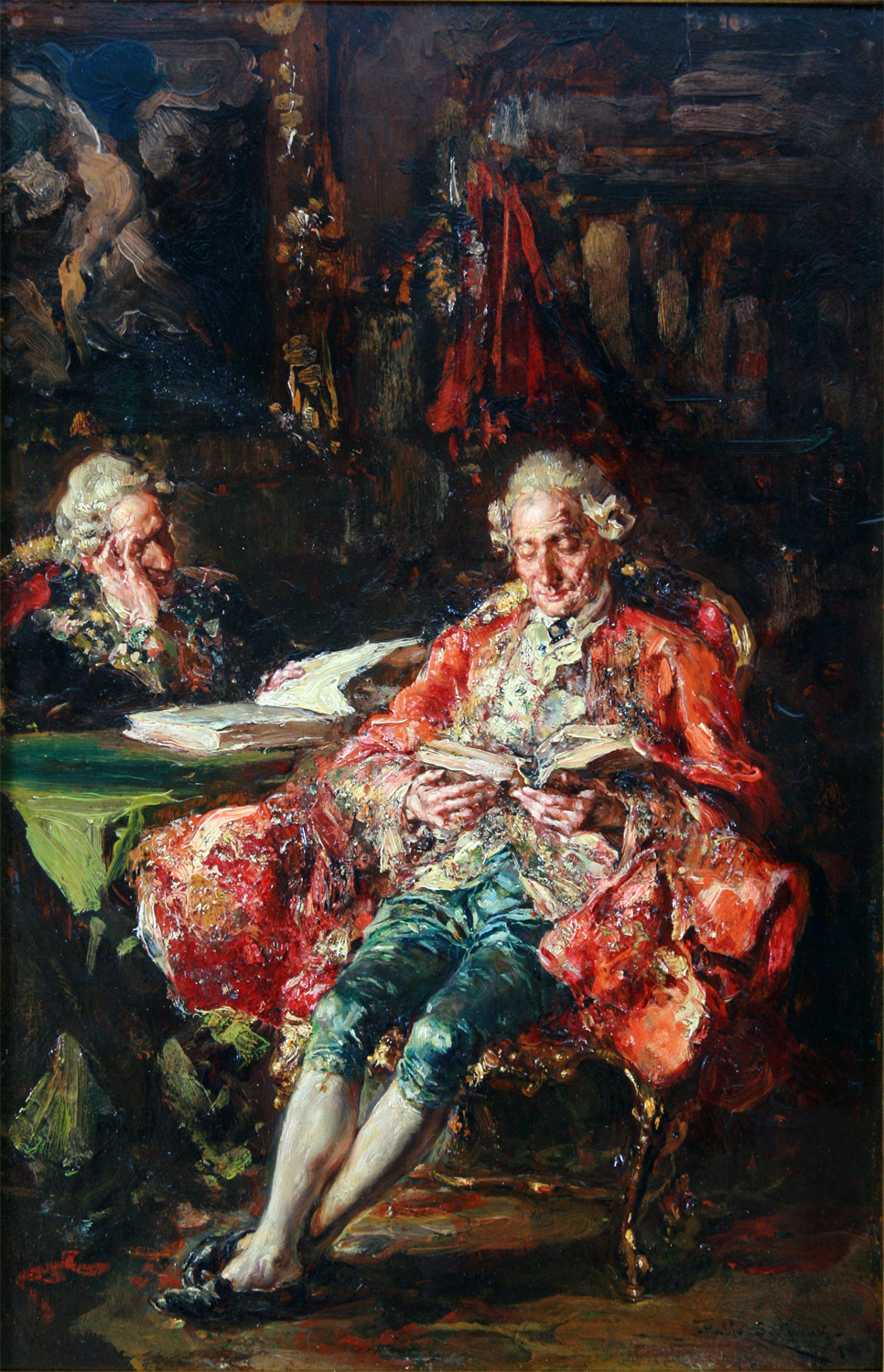 SALINAS TERUEL, Juan Pablo – Madrid – 1871 – Roma 1946 - Inició su formación artística en la Academia de Bellas Artes de San Fernando, en Madrid, y en 1885 participó en la exposición de la Asociación de Escritores y Artistas y en la Exposición Aragonesa, siendo galardonado en ambas con medalla de tercera clase. En torno a 1886 se trasladó a Roma para ampliar sus estudios gracias a una beca concedida por la Diputación Provincial de Zaragoza. Allí acudirá al Círculo Internacional de Bellas Artes, así como a las clases nocturnas de la Academia Chigi. Se integrará además en la colonia artística española residente en la ciudad, y trabajó junto a su hermano, el también pintor Agustín Salinas, quien llevaba instalado en Roma desde 1883. Ambos hermanos remitieron obras a la Exposición Nacional de Bellas Artes de Madrid de 1887; Juan Pablo envió “Marco Antonio y Cleopatra”, tema de la historia clásica. A semejanza de su hermano, su auténtico maestro, Salinas recreó también temas medievales de notable influencia toscana. Su trayectoria se mantuvo muy ligada a la de su hermano hasta que conoció, en un viaje a París, la obra de Ernest Meissonier, cuya influencia le llevó centrarse en el género de casacones, con el que alcanzó un gran éxito de ventas tanto en Francia como Italia, Europa central, Rusia y América. Por estos años expone en los Salones Roger e inicia sus famosas composiciones de ambiente dieciochesco, en los que aparecen personajes ataviados a la moda de la época en el marco de lujosos interiores, minuciosamente detallados a través de una técnica preciosista, que se recrea en la descripción colorista de ropas y encajes pero, sobre todo, en el magistral tratamiento de las carnaciones femeninas, deliberadamente sensuales. También en esta etapa Salinas realizará varias series para la decoración de grandes salones. Además de estos temas, abordó escenas de carácter orientalista e interiores de iglesia. En la última etapa de su trayectoria se aprecia una disminución del detallismo, un carácter más suelto y menos descriptivo. Actualmente Juan Pablo Salinas está representado en el Museo del Prado, en el de Bellas Artes de Asturias, en Oviedo, la Colección Bellver de Sevilla y otras colecciones públicas y privadas. Sus cuadros se caracterizan por un gran detallismo descriptivo y su estilo atrajo a numerosos imitadores . Sus obras alcanzaron precios elevadísimos
