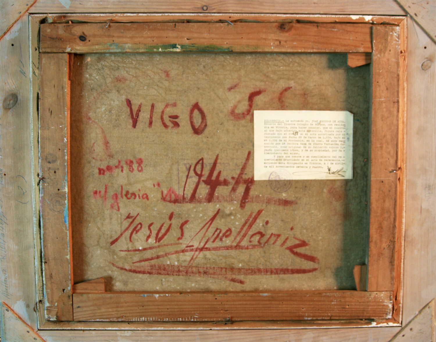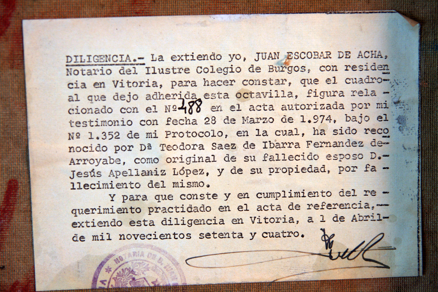 Pegado en la parte posterior de la tela, acta notarial fechada en 1974 con el número 488 sobre la obra, certificando la autenticidad de la misma por la viuda del autor.