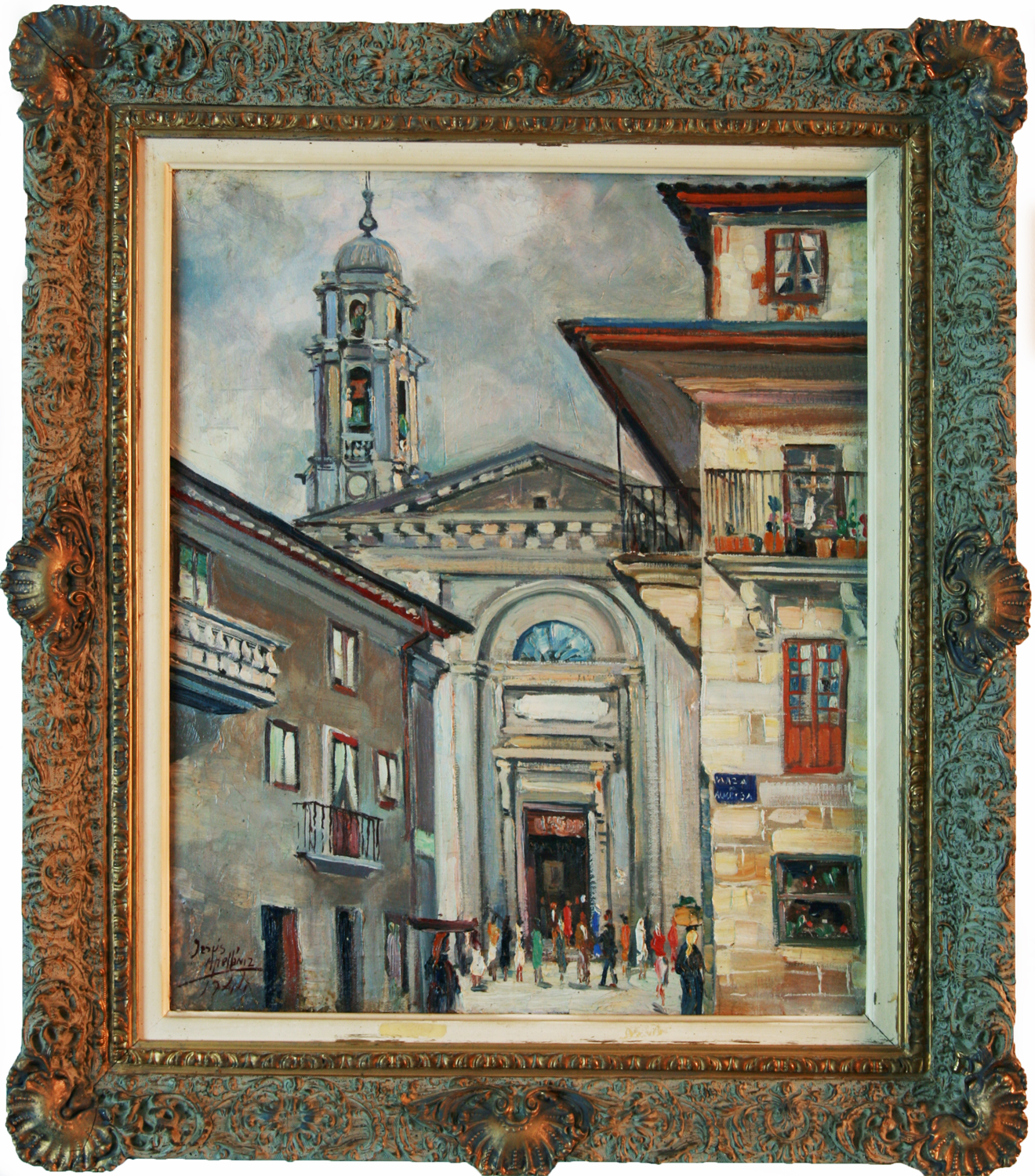 APELLANIZ LÓPEZ, Jesús - Vitoria 1897 – 1969 - Siendo muy niño comienza a mostrar especial interés por la pintura, y con doce años realiza su primera exposición en una tienda de la calle Dato de Vitoria. Entre 1911 y 1913 compagina la asistencia a clases de dibujo en la Escuela de Artes y Oficios, siendo su profesor Dn. Ignacio Díaz de Olano, con el trabajo en el taller de decoración de su hermano, dedicándose especialmente a la escenografía. Con 16 años participa en la decoración del Teatro Victoria Eugenia de San Sebastián. Después de recibir medalla de plata en la Exposición de 1914 organizada por el Orfeón Gallego de Lugo, decide ampliar su preparación en Madrid, donde permanece cuatro años formándose en la Academia de Bellas Artes de San Fernando y en los distintos museos madrileños. En 1918 viaja a París por primera vez, y trabaja como pintor-decorador de residencias nobiliarias y palacios en los alrededores de París. Fuera de su intensa actividad laboral la mayor parte de sus producciones de caballete, interpretan los antiguos modelos, inspirados en la naturaleza, pintando distintos paisajes de París además de algunos retratos, que presentará en 1923, en la que será su segunda exposición individual en la Ciudad del Sena. Se traslada a España, y siguiendo el espíritu del Art Noveau que había conocido en París, va adquiriendo cierto prestigio, que le facilitará numerosos encargos. Jesús Apellaniz , sigue pintando y participando en numerosas exposiciones que, en su mayoría serán elogiadas por la crítica. El lugar elegido para esta etapa artística será Zarautz (Guipúzcoa) que, al igual que su estancia anterior en Orio, le ofrece un marco excelente para ejercitar su actividad. Pinta los paisajes de las localidades que visita y a las que regularmente volverá, Zaragoza, Madrid, Bilbao etc. En 1948 se traslada a Vitoria, donde pinta el tipo de paisaje que más amaba, el alavés, y allí le encargan seis grandes lienzos para la Iglesia de San Miguel de Vitoria, encargo que finaliza en 1956, junto a la decoración de la techumbre. En 1954, abre al público las Galerías de Arte Apellániz de Vitoria.