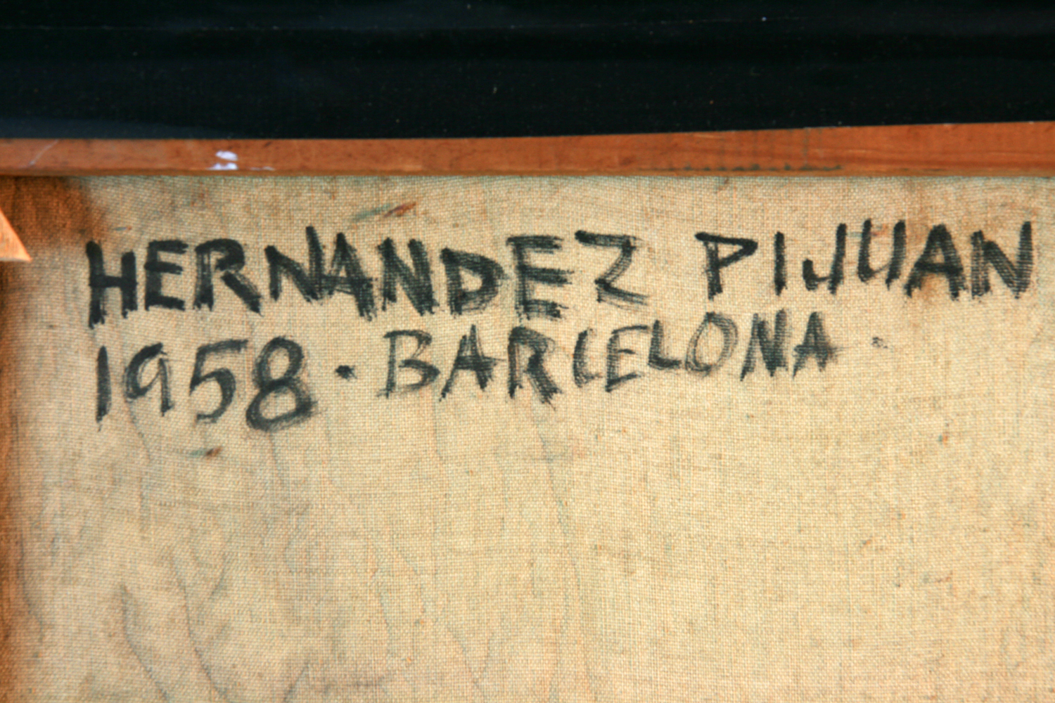 HERNANDEZ PIJUAN, Juan – Barcelona 1931 – 2005 - Estudió en la escuela Llotja, Escuela de Artes y Oficios de Barcelona y en la escuela de Bellas Artes de Sant Jordi en Barcelona entre los años 1952 y 1956. En 1953 realiza su primera exposición mostrando un estilo expresionista y con resonancia existencial. El Museo Municipal de Mataró acogió su primera exposición individual en 1955 y poco después fue uno de los fundadores del "Grupo Silex" junto a Carles Planell, Eduard Alcoy y Josep Maria Rovira. En 1957 se traslada a París donde estudió grabado y litografía en la Escuela de Bellas Artes, adoptando una figuración geométrica dónde destacan los elementos solitarios (fruta, copas, huevos, etc) sobre fondos y campos lisos de fajas de colores grises y verdes con inclusión de elementos matemáticos como cuadrículas, que sugieren una atmósfera mágica. Hasta mediados los años ochenta no vuelve al Informalismo. Su obra empieza a caracterizarse por el uso de una paleta de sólo blanco y negro. Desde 1977 ejerció como profesor en la Escuela de Bellas Artes de Sant Jordi de Barcelona, compatibilizando su actividad creativa con su labor docente. A partir de 1980 formó parte de la comisión de actividades de la Fundación Miró de Barcelona. En 1989 pasó a ocupar el puesto de catedrático de pintura de la Facultad de Bellas Artes de la Universidad de Barcelona, donde en 1992 fue nombrado Decano. Desde 1997 fue académico de Bellas Artes. En 1993 el Centro Nacional de Arte Reina Sofía realizó una exposición antológica llamada 'Espacios de silencio'. En el año 2011 el Museo de Arte Moderno de Moscú realizó una exposición titulada “Retrospective” sobre su obra. Hernandez Pijuan a sido ampliamente premiado a lo largo de toda su carrera en distintas exposiciones nacionales y extranjeras así como en1957 obtuvo el Premio de la Dirección General de Bellas Artes. Exposición Nacional. Alicante, 1958, Premio de Pintura "Peintres Résidens". París.1960, Premio "Primer Salón de Jazz". Granollers.1965 Premio "Malibor". VI Bienal del Grabado. Ljublijana.1966 I Bienal Internacional del Grabado de Cracovia.1970 Premio de la redacción Vijesnik Srijedu de Zabreg. IIª Bienal Internacional de Dibujos de Rijeka.1981 Premio Nacional de Artes Plásticas. Madrid.1985 "Cruz de Sant Jordi". Generalidad de Cataluña.2004 Premio Nacional de Arte Gráfico. Obras suyas, figuran en el Galerie Semiha Huber de Zurich, en el Graz de Viena, Ariadne de Colonia, O'Hana de Londres, Galerie Gabrielle von Loeper de Hamburgo, Yamaguchi Gallery Osaka, en Japón, Marlborough Gallery de Londres, Palais des Beaux-Arts de Bruselas, Guggenheim Museum de Nueva York, National Gallery deMontreal, Museo de Arte Moderno de Buenos Aires y en el Museo Nacional Centro de Arte Reina Sofía de Madrid. - Podriamos decir que, aunque solo ocho años más joven que Antoni Tàpies, Joan Hernández Pijuan pertenece a una generación posterior, pero entre los dos artistas configuran una imagen muy concreta de cierta particular manera de pintar que caracteriza a la modernidad barcelonesa puesto que, en la mayor parte de sus obras podríamos resumir como muros en los que se han grafitado signos muy simples, trasladando el interés plástico de la obra a las cualidades de la superficie de los fondos, sin menospreciar el valor de las figuras que se recortan sobre ellos.