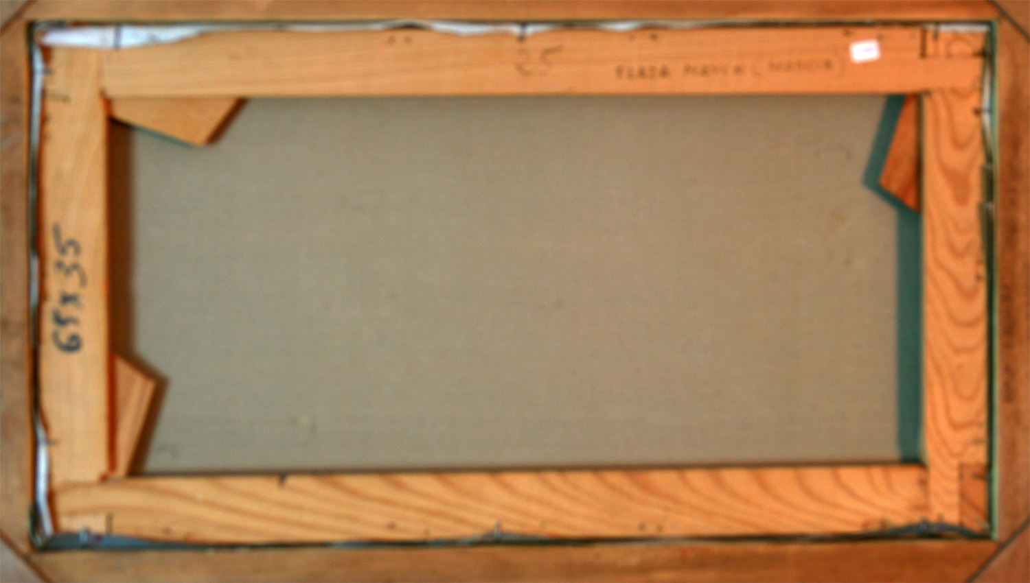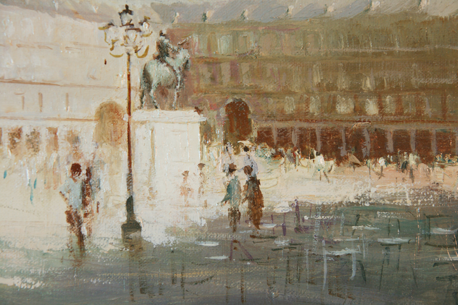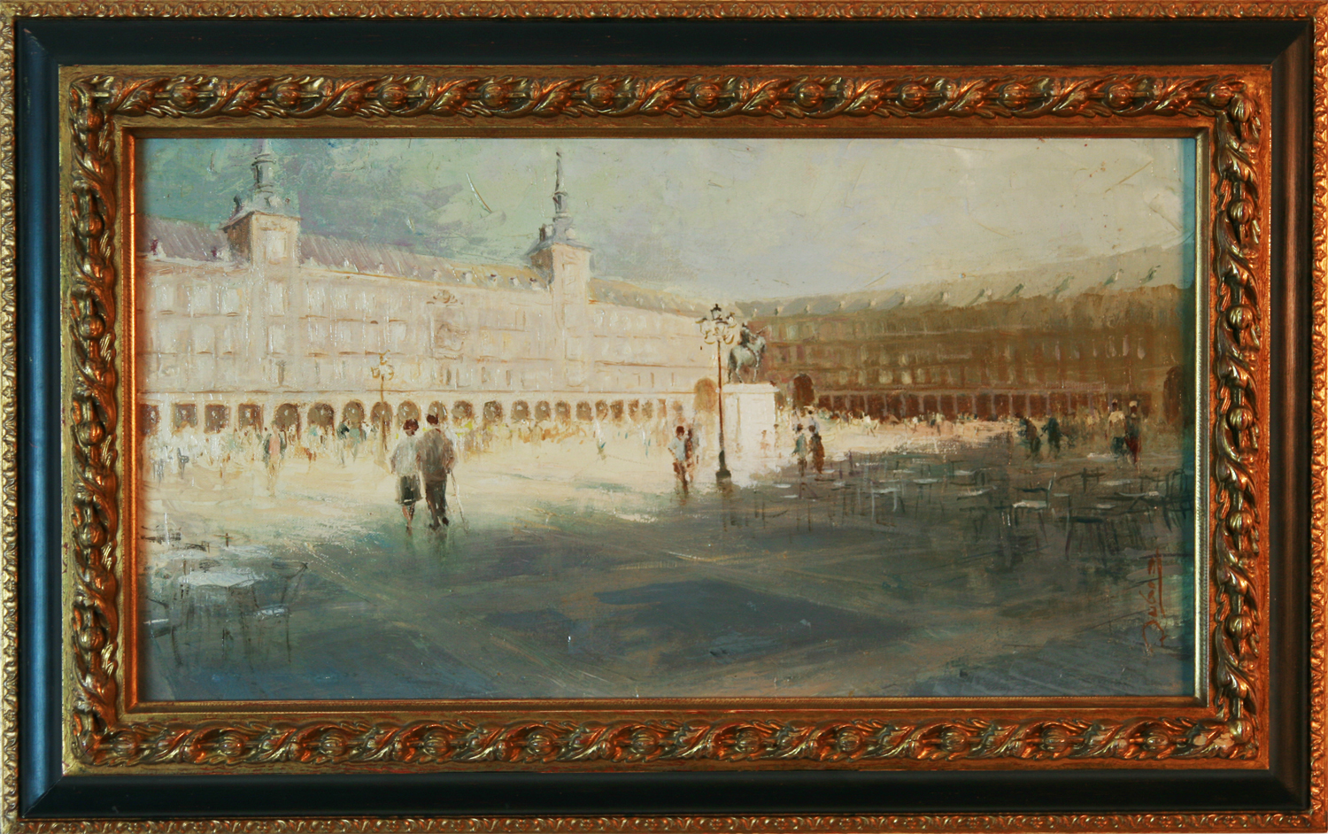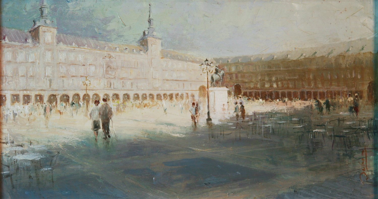 Paisaje urbano representando la Plaza Mayor de Madrid. El autor, describe la plaza bañada por el sol en el edificio frontal jugando con las sombras en primer plano, a la vez que sitúa multitud de personajes paseando en movimiento con lo que logra una espontánea obra llena de vida y movimiento de un cromatismo real y elocuente en base al contraste espontaneo de los tonos blancos y grises que juegan con la perspectiva difuminada del fondo, ofreciéndonos de éste modo un paisaje-espectáculo lleno de luz, que el autor ha combinado con vehemencia y habilidad en base a una paleta de colores neutros y limpios, logrando unas luces y sombras de excelente composición a los ojos del espectador.