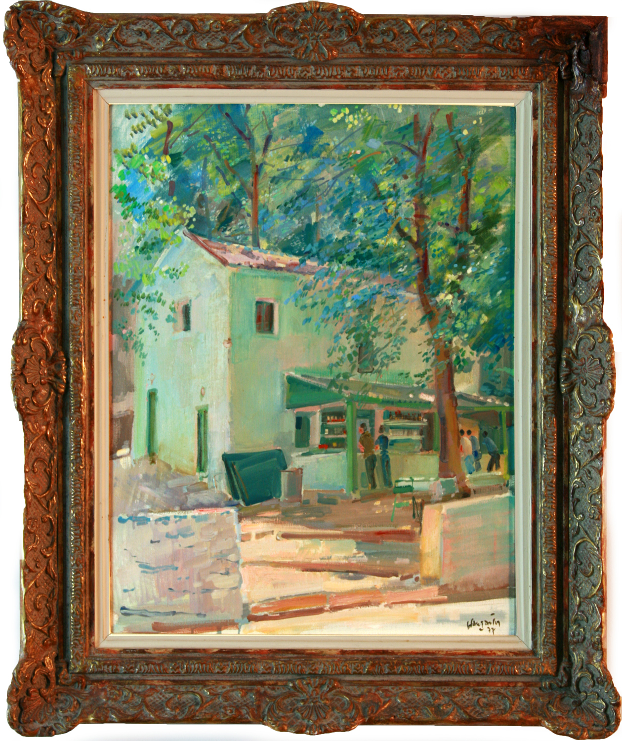 GRAU SANTOS, Julián – Canfranc (Huesca) 1937 ---- Su formación artística, tuvo lugar en la Academia de Bellas Artes de San Jorge de Barcelona, institución que ya en 1966 le concedió un tercer premio en su concurso de pintura En 1957 realizó su primera exposición individual en Zaragoza, posteriormente en París y desde entonces su carrera como pintor ha sido intensa y prolífica, exponiendo su obra en más de 100 muestras por todo el mundo, y recibiendo toda clase de premios. Vivió en París tras la Guerra Civil, donde tuvo la oportunidad de conocer la obra de los impresionistas y postimpresionistas que tanto le ha marcado durante toda su trayectoria. A la manera de los autores postimpresionistas, Grau Santos aplica una pincelada meticulosa, con gran expresividad, atenuando la perspectiva para dejar prevalecer el registro emocional. Transforma el modelo a representar con un dibujo esencialista y constructivo, partiendo de estructuras geométricas como hacía Seurat, y con una manera de distribuir la luz que se acerca a la escenografía teatral. Siguiendo la estela de Cezanne, une dibujo y color en una síntesis radical. Recrea los elementos naturales mediante el color, haciendo que los objetos no existan como tales, y que el dibujo parezca resultado, y no precedente, al uso acertado del color. Grau Santos es uno de los valores ciertamente consolidados de la figuración española, ya desde el último cuarto del Siglo XX. Su carrera pictórica se había iniciado precozmente alentada por la tutela artística de su padre, Emilio Grau Sala y de su madre Ángeles Santos. Con un sólido bagaje de calidad, su presencia pronto devino una constante en las colecciones de instituciones, ferias, museos y primeras galerías, tanto españolas como extranjeras. Los interiores, los fragmentos de su estudio o las vistas de su invernadero, son el telón de fondo de sus temas favoritos, alacenas, jardines, bodegones y marionetas. Paralelamente, goza de unas reconocidas dotes para la interpretación de la figura humana, lo cual le sitúa indiscutiblemente entre los mejores retratistas actuales. Esa misma sutileza y distinción fue el hilo conductor con el que durante muchas semanas llenó con sus ilustraciones las páginas del semanario "Blanco y Negro", un clásico de la ilustración en la prensa española.