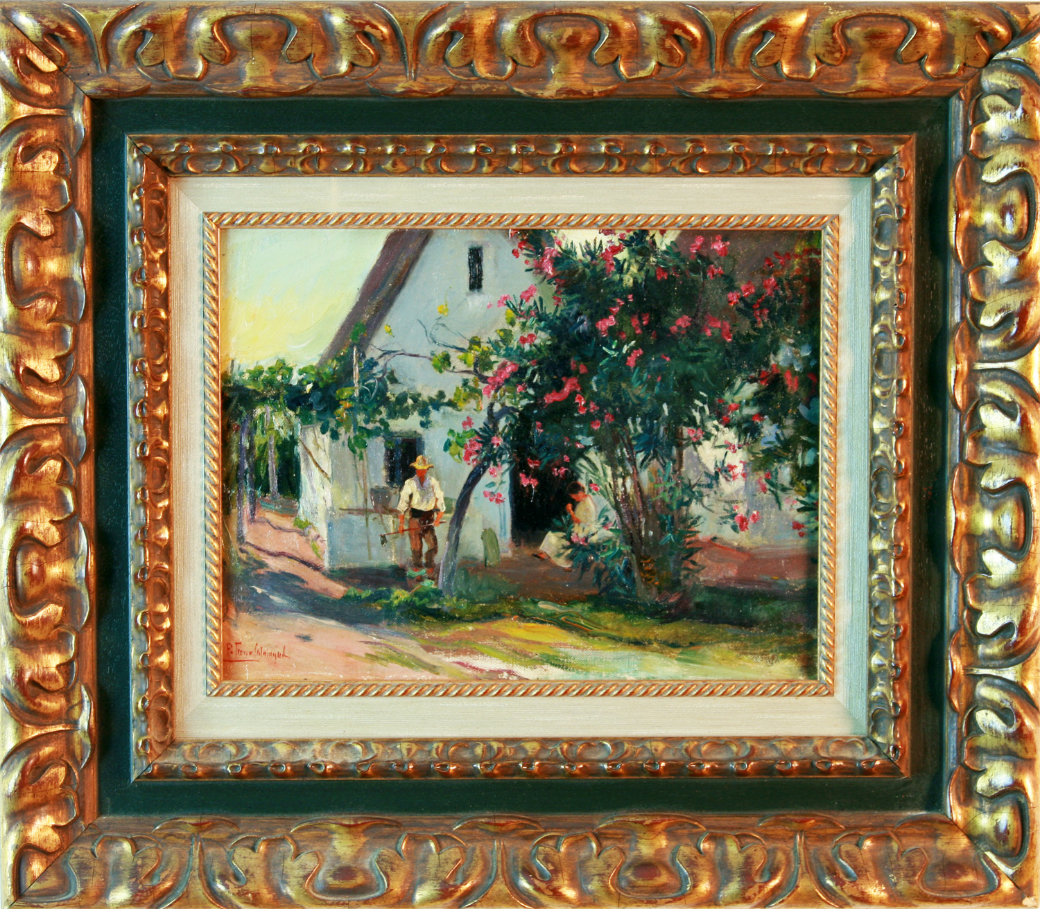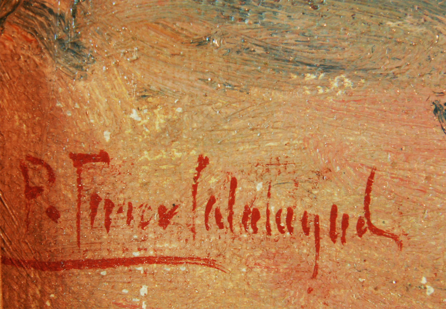 FERRER CALATAYUD, Pedro – Valencia 1860 – 1944 - A los doce años ingresó en la Escuela Superior de Bellas Artes de San Carlos, de la que después fue catedrático, director y académico. Como pintor del mar, formado en la escuela marinista de Sorolla, Monleón, Juste y Salvador Abril, puede considerarse de los mejores, por su magnífica interpretación del alta mar. En la Exposición Nacional de Bellas Artes de Madrid de 1895, su cuadro Salvamento de un náufrago le valió que le otorgasen la Cruz de Isabel La Católica y en 1910 y 1912 consiguió sendas Medallas de Oro. Igualmente fue premiado con Medalla de Oro y Diploma de Honor en la Exposición Regional de Valencia en 1909. Su actividad plástica no la centró únicamente en la pintura, ya que realizó diversas decoraciones para el Teatro Principal de Castellón, Palacio de Justicia de Valencia. Asimismo, diseño fallas, ganando en 1898 el Primer Premio de Lo Rat Penat. En 1991 el Ayuntamiento de Valencia le dedicó una exposición retrospectiva, junto a su hijo, el también pintor Ferrer Amblar, en el Museo de la Ciudad. La dispersión en que se halla la obra, a pesar de estar bien representada en el Museo de Bellas Artes de Valencia y en otras colecciones valencianas, su personalidad algo introvertida, su alejamiento de los circuitos comerciales del arte, así como otros factores, como fue su absorbente dedicación docente o su trayectoria vital afincada casi exclusivamente en Valencia, explican en cierto modo el desconocimiento que se tiene aún hoy de su obra, uno de los pintores más representativos de la escuela marinista valenciana.