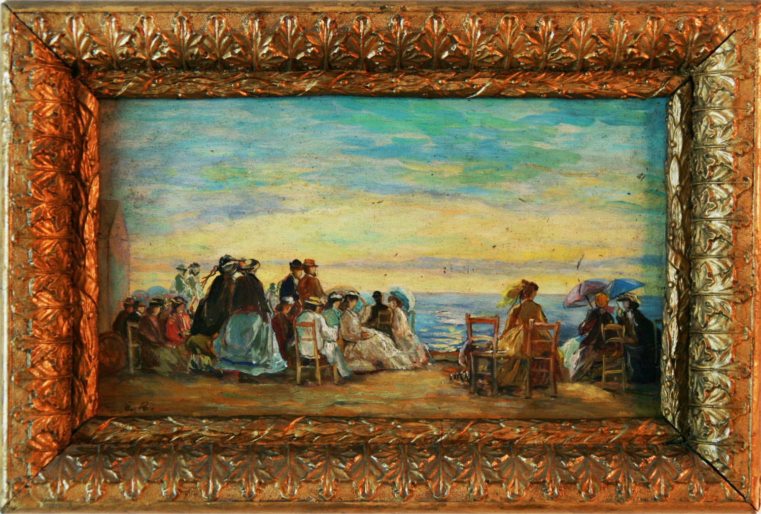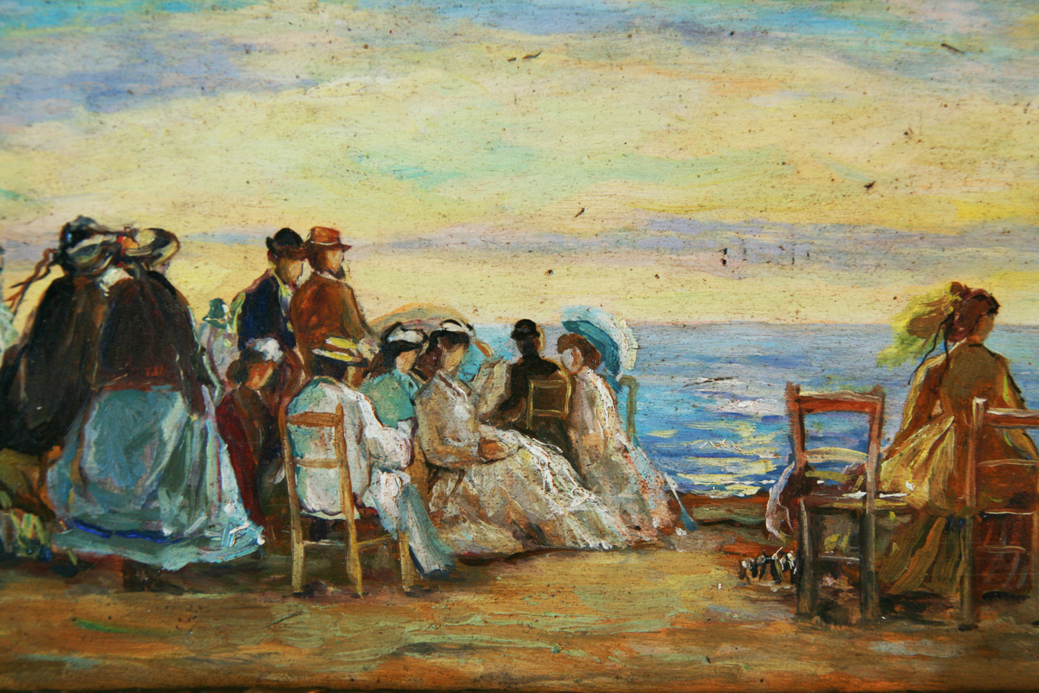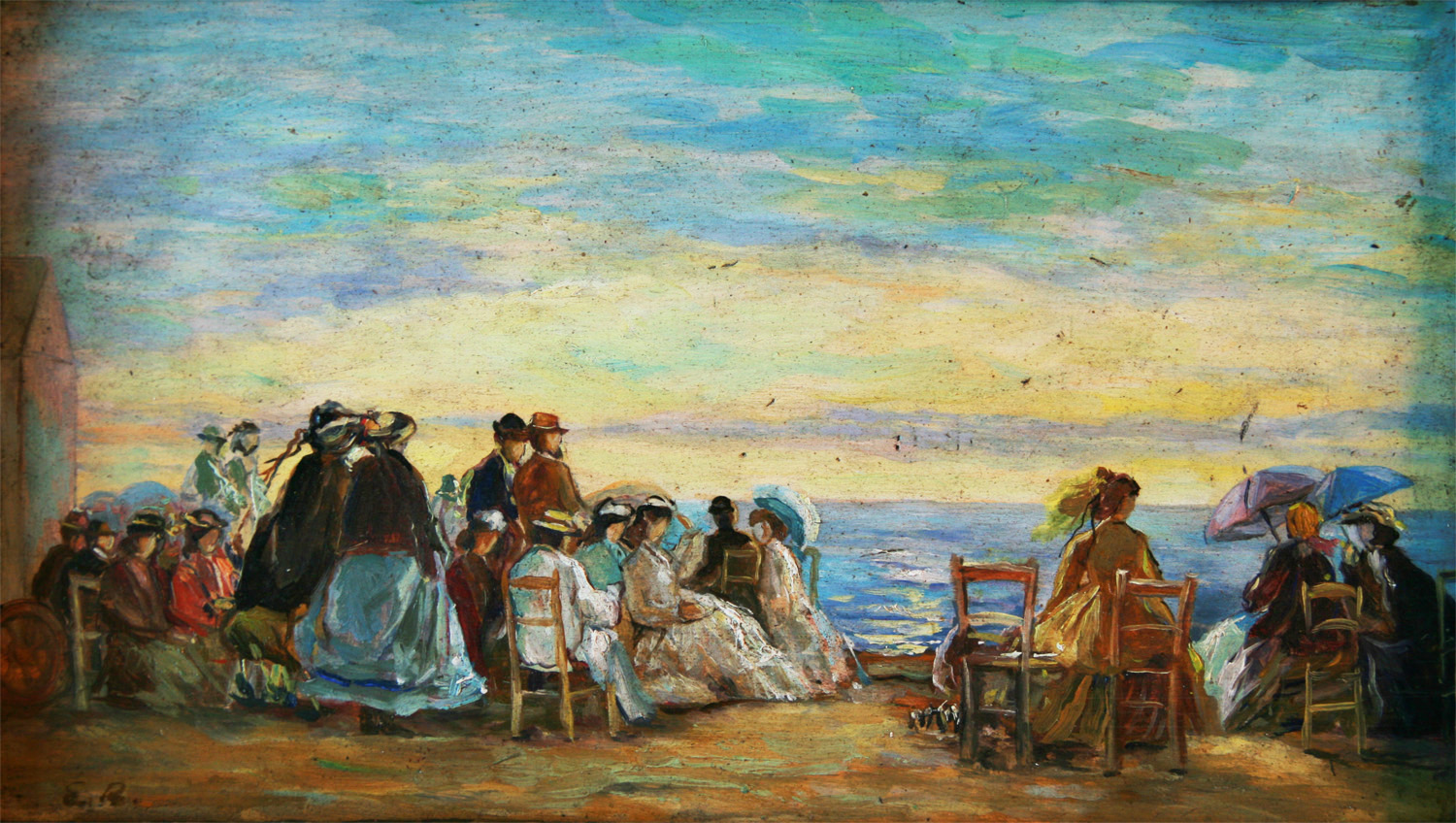 La obra se inscribe claramente en la estela estética de Eugène Boudin, uno de los pioneros de la pintura al aire libre y maestro en capturar la atmósfera costera. El seguidor que realiza este cuadro adopta con acierto los rasgos más característicos de Boudin: la ligereza del trazo, la vibración luminosa del cielo y la atención a las escenas cotidianas de ocio burgués a orillas del mar. La luz es el verdadero hilo conductor del cuadro. El cielo, amplio y dominante, presenta las variaciones tonales típicas del maestro francés, desde los azules perlados hasta nubes que parecen disolverse. Esta atmósfera luminosa envuelve la escena y confiere al cuadro una sensación de serenidad y frescura. El mar, apenas insinuado en el horizonte, actúa como un telón que completa la sensación abierta y respirable del conjunto. El pintor de la obra, situada en el Siglo XIX, logra en definitiva, recrear el espíritu de Boudin: la poesía de lo cotidiano, la observación directa del paisaje costero y la captura del instante de modo que, la obra transmite un encanto propio, una mirada sensible hacia la vida en la playa y la relación íntima entre luz, figura y naturaleza.