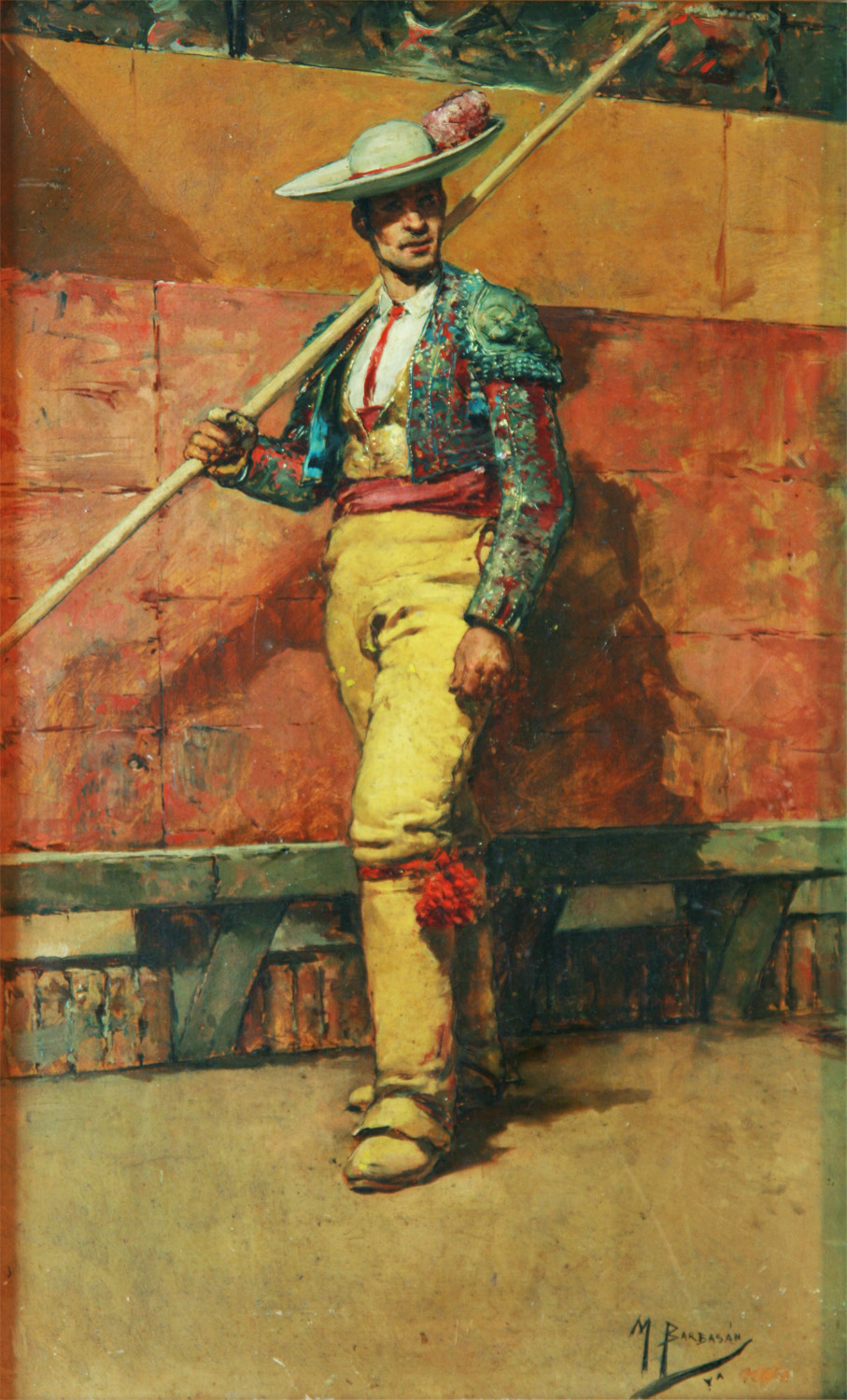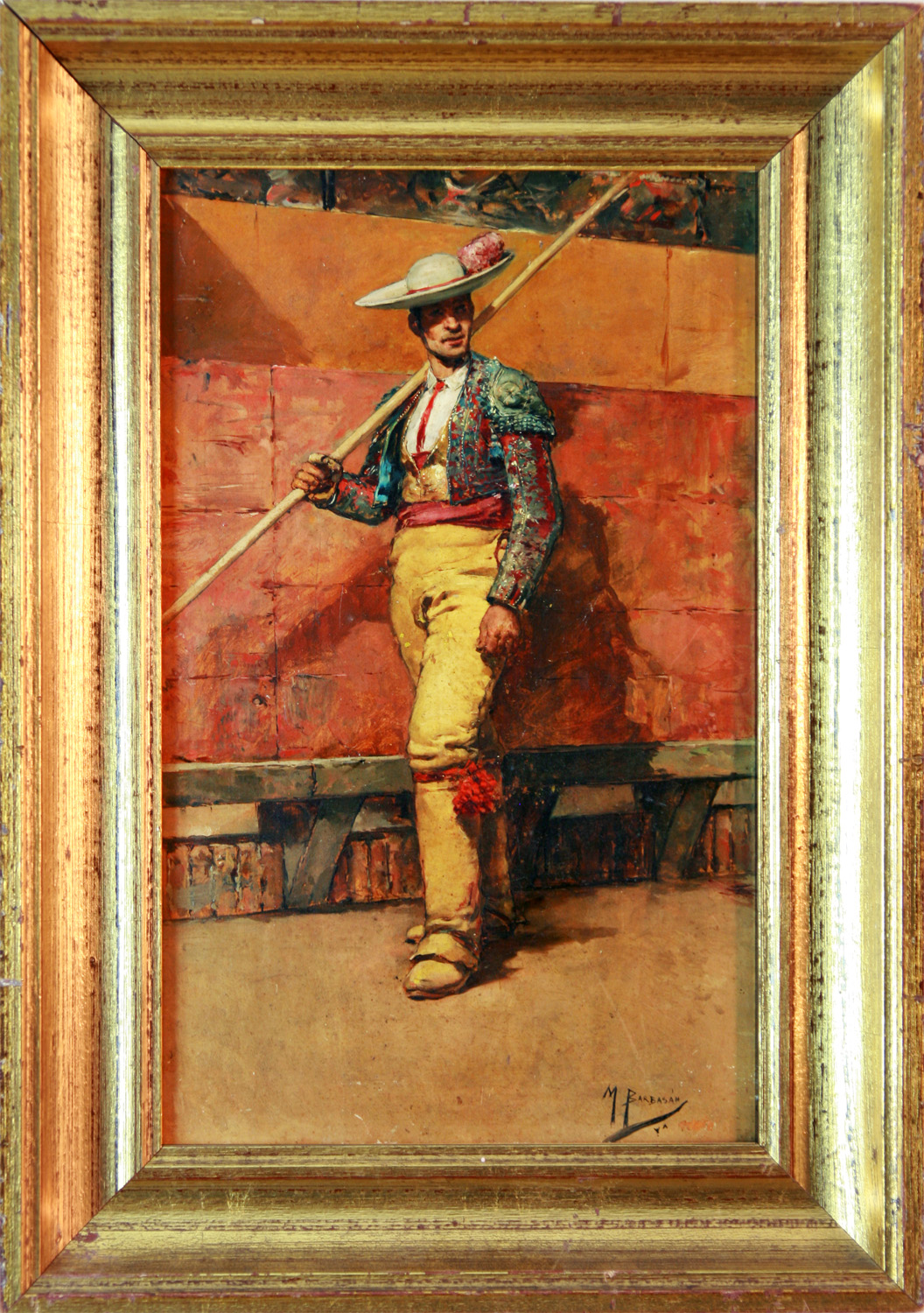 BARBASÁN LAGUERUELA, Mariano - Zaragoza 1864 – 1924 - Estudia en la Escuela de Bellas Artes de San Carlos de Valencia, donde establece estrecha amistad con los también pintores Joaquin Sorolla y Salvador Abril. Concluidos sus estudios, se traslada a Madrid en 1887, desde donde realiza diversos viajes a Toledo, En 1889 obtiene la pensión de la Diputación de Zaragoza para trasladarse a Roma ciudad en la que permanece algún tiempo con su paisano Francisco Pradilla. Se calcula que permaneció en Italia más de treinta años desarrollando una intensa actividad artística fuera de nuestras fronteras. De 1892 es el cuadro Café árabe, un retrato colectivo de gran valor documental de pintores españoles en Roma disfrazados de árabes para un carnaval. A partir de 1892, comenzó a frecuentar el pueblecito de Anticoli Corrado, próximo a Roma, y a desarrollar un gusto por el paisaje costumbrista que le proporcionó gran fama y suscitó el interés de numerosos marchantes extranjeros. Tras diversas estancias en Madrid y Montevideo, regresará a Zaragoza, siendo nombrado académico de Bellas Artes de San Luis, en la vacante de Pradilla y, celebrando dos años más tarde una gran muestra en el Centro Mercantil de dicha ciudad. Llevó a cabo numerosas exposiciones en Madrid, Berlín, Munich, Viena, Montevideo etc. Concurriendo a certámenes y concursos artísticos, como las Exposiciones Nacionales de Bellas Artes y las Internacionales de Roma de 1905 a 1914. Sólo en 1923, dos años después de su regreso, realizó una muestra antológica, muy elogiada, en el Centro Mercantil de Zaragoza. Tras su muerte, su hijo organizó una nueva exposición antológica en 1925 que contribuyó a consagrarle definitivamente como una figura clave de la pintura aragonesa de finales del XIX y principios del XX. En 1965, tuvo lugar en el Museo Provincial de Zaragoza una magna exposición conmemorativa de su primer centenario. Figuran obras suyas, en el Museo del Prado y Museo Provincial de Zaragoza. Así como en numerosas colecciones particulares, estando representado además en el Museo de Arte Moderno de Roma, San Petersburgo, Munich, Varsovia, Montevideo y Río de Janeiro. Su estilo es realista, con cierta influencia del impresionismo (preimpresionismo italiano, principalmente) y de la obra de Fortuny. Destacan sus obras por su colorismo y luminosidad.