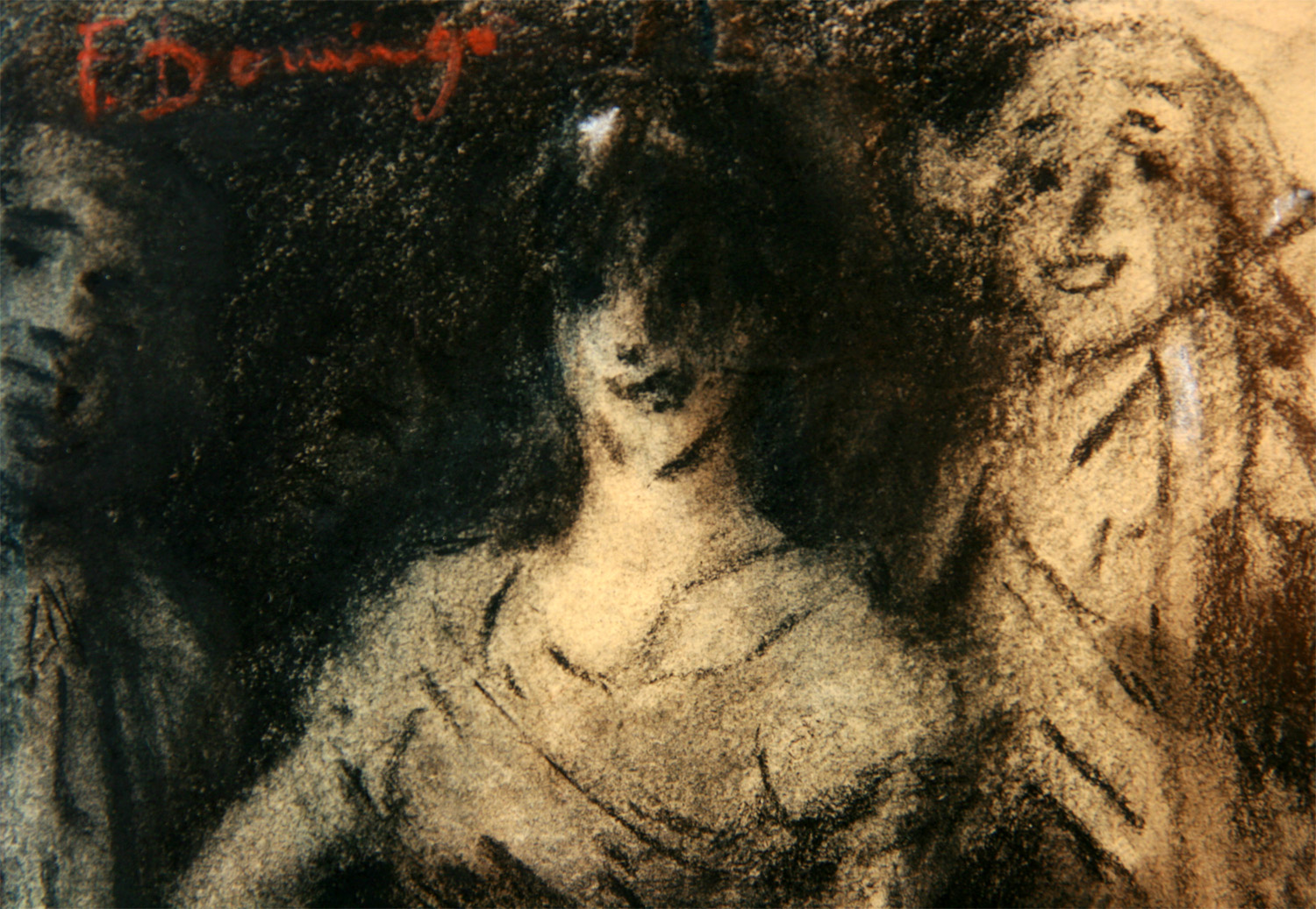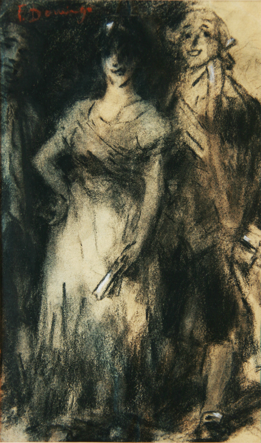 DOMINGO MARQUÉS, Francisco - Valencia 1842 - Madrid 1920 - Hasta sus dieciocho años, no se tienen datos de Francisco Domingo, y es a esa edad, cuando ingresa en la Academia e San Carlos, donde tuvo como compañero a Salvador Martínez Cubells. Por los datos conservados en el archivo de la Academia, se sabe que durante el curso 1862-1863, figura matriculado y examinado en dibujo, obteniendo nota de sobresaliente. Es conveniente, comentar, que en la Exposición Nacional de 1864, inaugurada el 13 de diciembre, Domingo, presentó un cuadro titulado, “La Expulsión de los Moriscos de Valencia”, estrenándose ya desde muy joven en la senda del tema nacionalista que tan buenos triunfos le había de proporcionar de cara a su tierra. Siguió exponiendo con gran éxito en la Nacional de 1866 y 1867, en ésta última, presentando cuadros de claro matiz nacionalista con los que alcanzó medalla de oro. Animado por sus triunfos, aspira a plaza de pensionado, y la obtiene con el fin de trasladarse a Roma el 4 de abril de 1868. Inmediatamente se pone a trabajar, bajo la dirección de Eduardo Rosales, y en julio del mismo año alquila un estudio, situado en las afueras de la Puerta di Popolo. Allí, realiza estudios preparatorios, para una obra de grandes dimensiones, con destino a la exposición de Madrid. Aconsejado por el crítico de arte Peregrín García Cadena en el año 1871 de concurrir a la Exposición Nacional, presenta cuatro óleos, que fueron muy aplaudidos por la crítica, que advirtió su enérgica factura, vigoroso colorido, y los sorprendentes signos de modernidad, que la obra encerraba. Sin embargo, su obra triunfante y más sobresaliente, que le proporcionó fama internacional fue “Santa Clara”( Actualmente Museo de Bellas Artes de Valencia), llena de una línea del mas ponderado naturalismo, y que por su dicción, recuerda a Velázquez . Animado por el éxito, decide trasladarse de nuevo a Madrid, donde, según parece, logró hacerse con una importante clientela. Que Domingo era un valor en alza, es prueba, la intervención de Henri Haro, conocido marchante francés, acerca de su marcha con destino a París. Desde éste momento se produce un cambio de estilo, que culmina en el cuadro, de pequeño formato realizado con minucia técnica, a semejanza de Fortuny y Meissonnier, tan cotizados por Goupil, el mismo que, sin duda, aconsejó a Domingo, comercializando su obra, y difundiendo su producción, ya no sólo en Francia , sino también en Inglaterra a través del marchante Everard, además de los marchantes americanos, que actuaban de intermediarios, entre los pintores europeos y los coleccionistas de Estados Unidos. Domingo, pintó sin descanso y su producción fue muy fecunda y a partir de 1900, trabaja para el mercado argentino, donde a través de José Artal, se le brinda la oportunidad, de tratar directamente con diversos coleccionistas que se hicieron pintar retratos, entre los que se encuentran los de los presidentes Sarmiento y Mitre. En 1914 con motivo del estallido de la Primera Guerra Mundial, volvió a España y se afincó de nuevo en Madrid, consiguiendo el reconocimiento oficial. Ingresó en la Academia de Bellas Artes de San Fernando en 1917, y fue objeto de un homenaje público en Valencia al año siguiente. El estilo maduro de Domingo se muestra heredero de la tradición naturalista del barroco, y su pincelada llega a deshacer la materia pictórica para centrar su interés en el color y la luz. Domingo, fue además de un gran dibujante, un pintor singularmente dotado y de una paleta excepcionalmente jugosa. Su producción harto copiosa, oscila entre el naturalismo, con ciertas reminiscencias barrocas de su primera época y las pequeñas manchas de color, sabiamente abocetadas de fresca y genial espontaneidad. Casi siempre con la idea de Goya al fondo por su magistral abocetamiento, el estudio de la luz y la sugestión temática, cuando no se recrea en el género mosquetero que le valió el sobrenombre de “Meissonnier español”. Está representado en el Museo del Prado, los de Bellas Artes de Valencia, Málaga y Asturias, la Hispanic Society y el Metropolitan de Nueva York y el Lázaro Galdiano de Madrid, entre muchos otros.