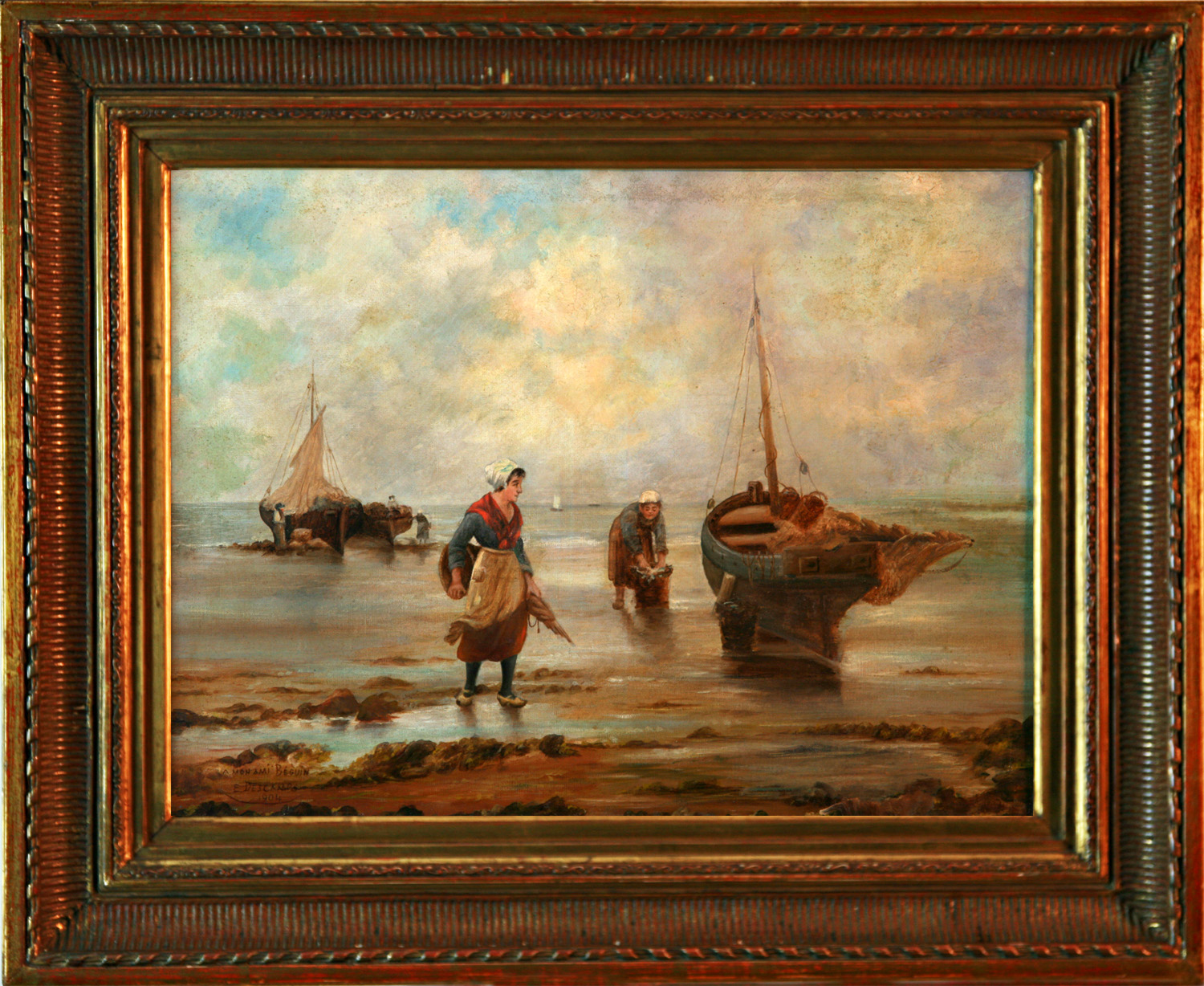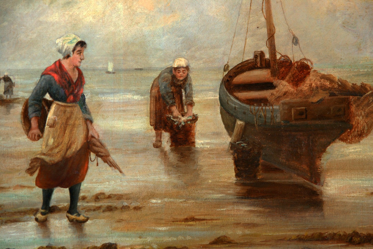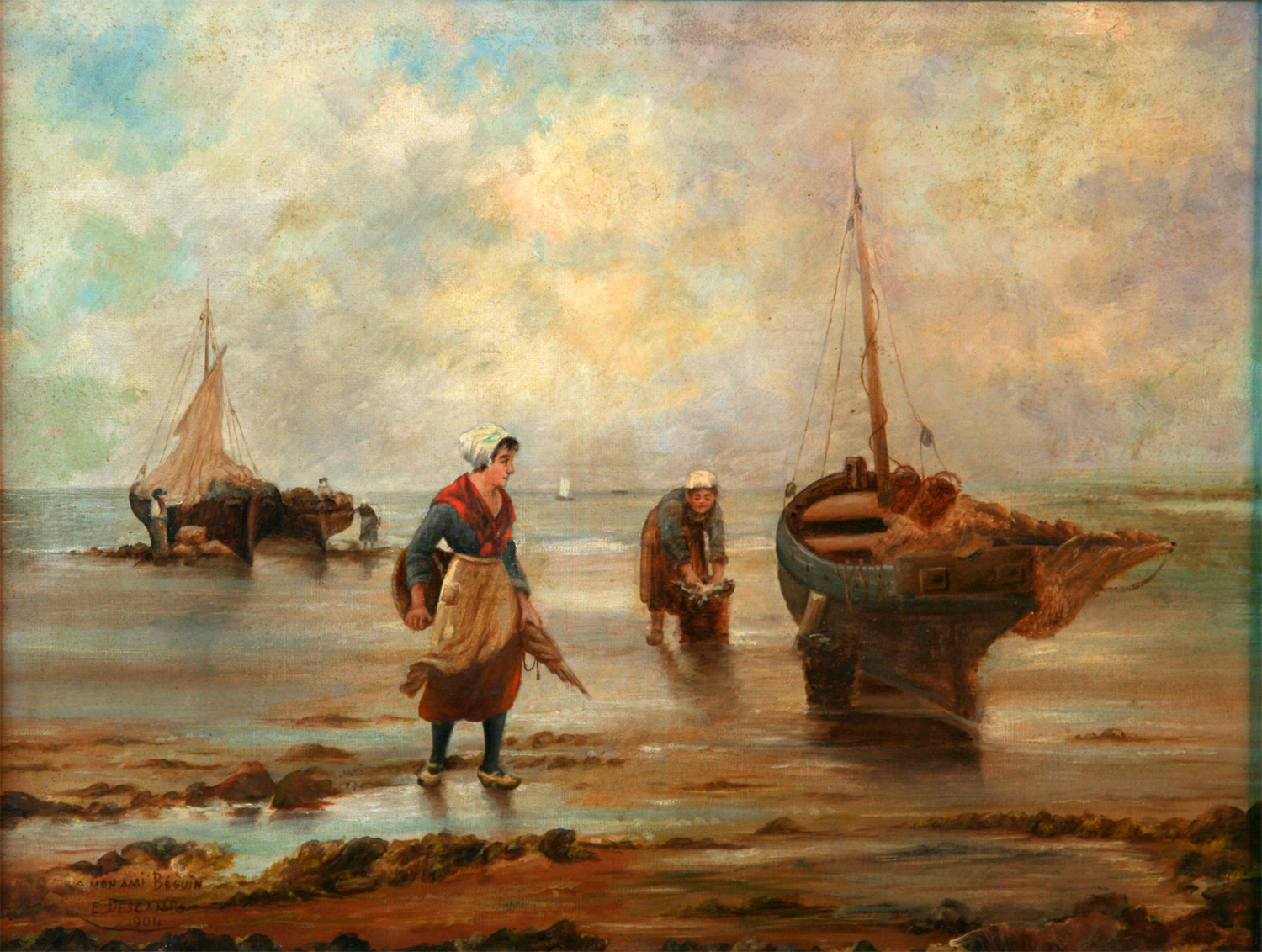 Desde el punto de vista temático, la obra firmada E Descamps y dedicada en 1904, se inscribe en la tradición del costumbrismo marinero, muy vinculada a las costas atlánticas y cantábricas, donde el trabajo femenino en el mar adquiere un fuerte valor identitario. Las mariscadoras aparecen como figuras activas, concentradas en su labor, subrayando la dignidad del trabajo humilde y la relación directa entre el ser humano y la naturaleza. No se trata de una escena idealizada, sino de una visión sobria y veraz de la vida litoral. Las barcas varadas, aportan estabilidad a la escena y equilibran el peso visual del grupo humano. Estas embarcaciones, inactivas en ese momento, funcionan simbólicamente como extensión del trabajo del mar y como vínculo entre la faena terrestre y la marítima. Desde una lectura simbólica, las mariscadoras encarnan la constancia, la resistencia y la transmisión de saberes tradicionales, mientras que las barcas varadas aluden a la espera, al descanso momentáneo del mar y al ciclo continuo del trabajo pesquero. La obra, en conjunto, ofrece una mirada empática y respetuosa hacia el mundo marinero, convirtiendo una escena humilde en un testimonio artístico y social de gran valor.