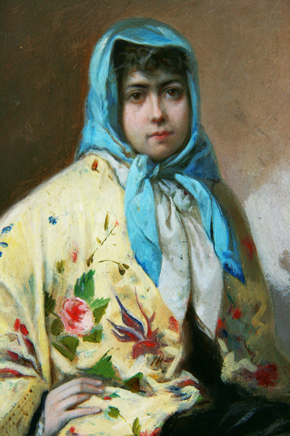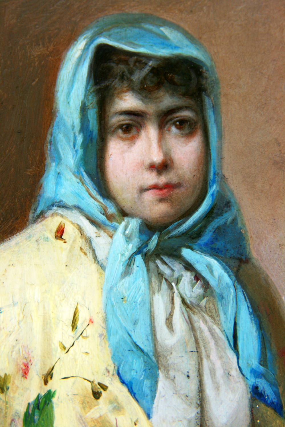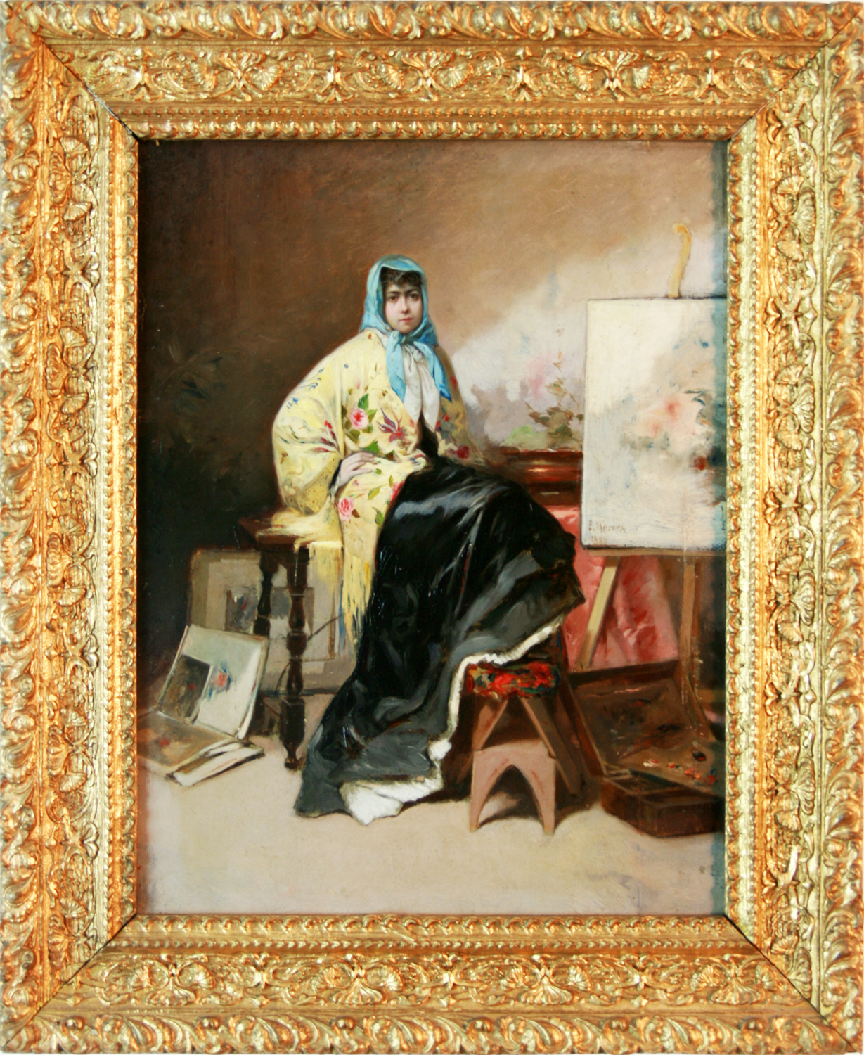 Se trata de la imagen de una joven que captura la esencia de una época llena de romanticismo y belleza. Viste un pañuelo azul atado con delicadeza en su cabeza, que contrasta maravillosamente con su vestido amarillo floreado. El vestido, con sus suaves tonos amarillos y estampados de flores, evoca la frescura de la primavera, mientras que el pañuelo añade un toque de elegancia y un aire de coquetería a su natural belleza. Su cabello, cuidadosamente recogido, asoma con algunos mechones sueltos que enmarcan su rostro, dando al personaje un aspecto juvenil y alegre. El caballete de pintor y la paleta en el suelo dan la sensación de la espera para un retrato del natural.