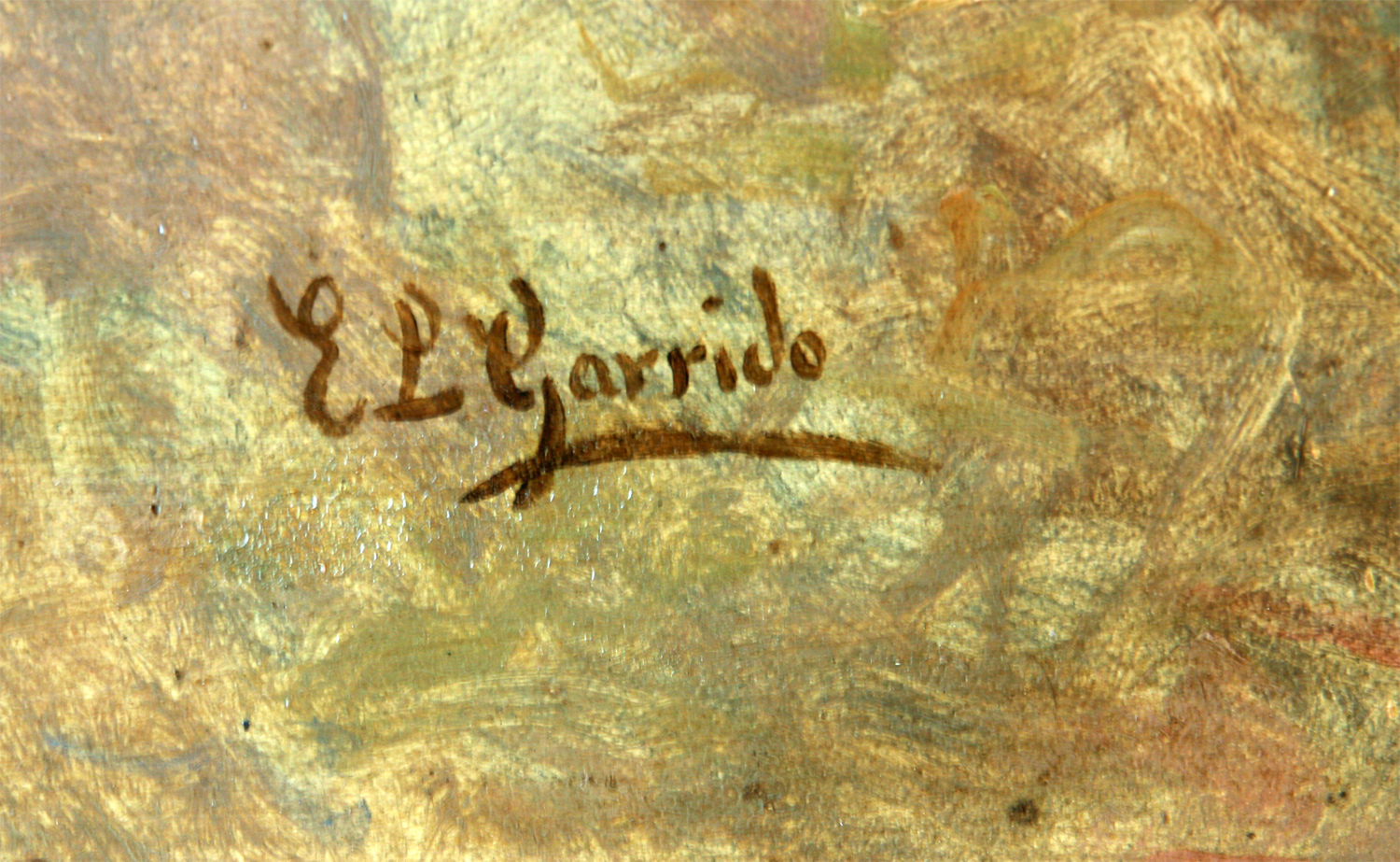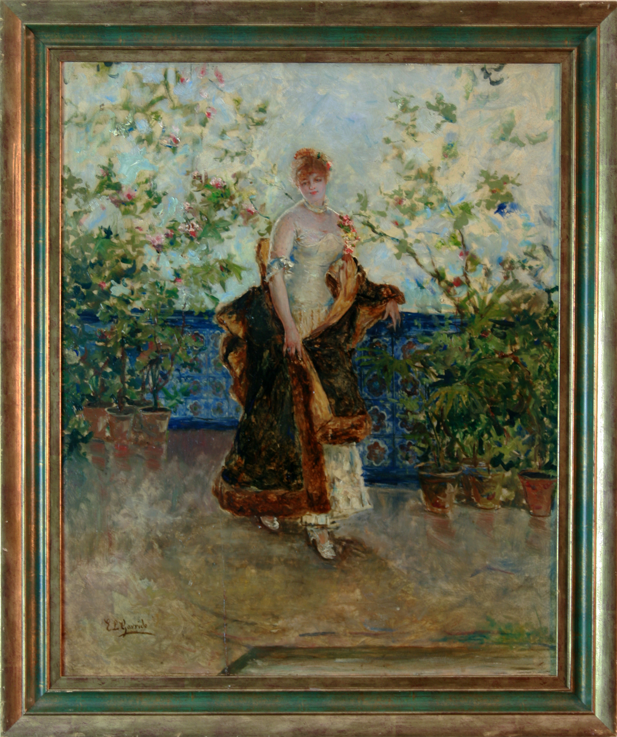 LEON GARRIDO, Eduardo – Madrid 1856 – Caen (Francia) – 1949 - Se inicia, en las nociones elementales de la pintura con su padre, el político y pintor aficionado Fernando Garrido Tortosa. Entra a estudiar en la Escuela Especial de Pintura, Escultura y Grabado de Madrid y como discípulo de Vicente Palmaroli, quien le programaría una convencional carrera académica y le animaría a presentarse a las oposiciones para una de las dos pensiones de número en la primera convocatoria de la recién creada Academia Española de Bellas Artes en Roma. Lo cierto es que firma para una de las dos plazas de pintura de historia y de figura, así como para la de paisaje a la corta edad de diecisiete años en la que obtuvo un holgado cuarto puesto entre los trece opositores que definitivamente inician la oposición. Garrido, solicita por instancia dirigida al ministro de Estado una pensión de gracia por si quedara vacante alguna de las dos plazas y utiliza como argumentos la buena marcha en la oposición haciendo acompañar en su solicitud una recomendación firmada por ocho personas. Viaja a París y acude al taller de Raimundo de Madrazo cuya pintura le influirá profundamente y condicionará su temática de escenas galantes y de estética rococó. El chisporroteo cromático no solamente se vuelca en las abundantes escenas de baile, sino en episodios también de género, con interiores de pocas figuras, frecuentemente femeninas con gran sensualidad. Desde luego no fue el género su única producción, tal como testimonia su participación en los Salones parisinos. Expuso también en Múnich y Londres donde también deja abundantes testimonios de su pintura, sin embargo, su mayor concurrencia se produce en los Salones de 1877, 1881 y 1887. En 1875 Garrido ya no vuelve a España, sino que viaja a Italia acompañando a Palmaroli cuando éste, después de su etapa parisina de 1873 a 1883, se traslada a Roma en ese último año donde es nombrado director de la Academia Española en la Ciudad Eterna. Allí, recala el también Alcázar Tejedor, que aunque, no como pensionado oficial de la Academia en Roma, sí, llega a exponer con algunos otros de la colonia española, (el grupo oficial) en 1884. De sus viajes por Italia, contacta en Venecia con pintores españoles de la talla de Fortuny y Martín Rico y allí saca especial provecho de los canales venecianos, respondiendo así a la sugestión de la ciudad de la laguna que mantuvo sobre los pintores españoles por las conexiones artísticas, significando así un polo de atracción de la ciudad para los fortunescos como Ricardo de Madrazo, Martín Rico y otros, en tanto que el más conocido seguidor de Fortuny, José Villegas se convierte en centro polarizador de los españoles en los años finales del siglo XIX, eligiendo Venecia para numerosas estancias a partir de 1877. Garrido viajó asimismo a Estados Unidos en 1896, donde se dice que su pintura alcanzó gran éxito comercial, igual que en Londres. Pero fue su asentamiento en suelo francés el que posibilitó su nombramiento de profesor de la Escuela de Artes y Oficios de Varennes-sur-Allier ya a comienzos del siglo XX en 1905. Su desconexión de la vida artística española explica su ausencia de las Exposiciones Nacionales de Bellas Artes en cuanto a característicos certámenes oficiales y el que apenas esté representado en nuestros museos, por lo que aún es más de apreciar la existencia de obras suyas en el Museo del Prado, así como el titulado “retrato de niño”. Su estilo está influido por el impresionismo y para algunos críticos guarda semejanzas con el de Manet. Su obra está dedicada principalmente a temas costumbristas, retratos de elegantes mujeres ataviadas con ropas de la Belle Époque y a la reproducción de escenas galantes. Alcanzó gran éxito en su época y expuso en París, Londres y Múnich. Algunos de sus lienzos pueden contemplarse en el Museo del Prado (Madrid), Museo Nacional de Bellas Artes (Argentina), Museo de Bellas Artes de Bilbao y colecciones particulares como la Colección Bellver de Sevilla.