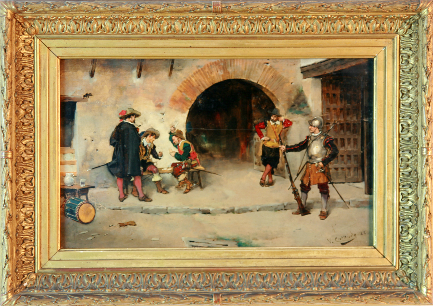 CUTANDA TORAYA, Vicente – Madrid 1850 – Toledo 1925 – Estudió en la Escuela de Bellas Artes de San Fernando de Madrid y fue miembro correspondiente de la Real Academia del mismo nombre de Toledo, ciudad a la que dedicaría casi toda su producción pictórica y sus desvelos, participando activamente en la Comisión de Monumentos y en labores de restauración. Vivió en el País Vasco y su obra es muy representativa del realismo social del siglo XIX. Por contacto con su amigo el pintor Ricardo Arredondo a quien había conocido en París y que era partidario del realismo social, abandonó el preciosismo a lo Meissonier y se inclinó por la pintura realista y plenairista, con un gran componente social, lo que se muestra en muchas de sus obras. A pesar de su aspecto desaliñado, de su aire bonachón y sencillo, el pintor Vicente Cutanda fue un hombre intrépido y moderno, un liberal que vivió una época de grandes transformaciones industriales y sociológicas. Muchas de sus pinturas representan escenas de la vida en los Altos Hornos de Vizcaya. Influido por la escuela del pintor madrileño Eduardo Rosales, se distinguió también en los temas históricos. Cultivó la técnica del dibujo a la mina de lápiz, el grabado, la acuarela y, principalmente, la pintura al óleo. A pesar de ser hijo único su infancia no fue fácil. Comenzó los estudios de arquitectura que abandonaría para cursar un curso especial de pintura en Madrid. Su primer trabajo fue “Un mercado de Ávila” con el que participó en la exposición de la Casa Bosh. Conoció a grandes pintores como Joaquín Sorolla y Mariano Fortuny. En 1884 ganó la plaza de profesor de dibujo en la Sociedad Cooperativa de Obreros de Toledo, ciudad de la que se enamoró por su belleza artística, como por las amistades con otros artistas que allí realizó. Con una posición estable se casó con su novia de la infancia, la navarra Luisa Salazar. Su cuadro más famoso,” Una huelga de obreros en Vizcaya”, fue galardonado con el primer premio de la Exposición Nacional de Bellas Artes de 1892 y fue adquirido por el Museo del Prado que lo tuvo depositado en el ministerio de Marina. Tras la guerra civil y con el nuevo régimen franquista el cuadro se consideró inadecuado por tema y fue descolgado; se guardó enrollado y perdió su singular marco, tallado y patinado imitando vigas de acero con sus remaches. Tras darse por perdido durante décadas, en 2001 fue hallado en malas condiciones y en fecha posterior ha sido restaurado, rehaciéndose el marco según fotografías antiguas. También sus obras se llevaron a grabados para revistas ilustradas, como el grabado de una cabina de locomotora de vapor con maquinista y fogonero, para la Cuarta Exposición Bienal del Círculo de Bellas Artes de Madrid, titulado "En peligro inminente" y publicado el 30 de julio de 1894 en la revista La Ilustración Española y Americana. Así como el grabado iluminado a color de "La nochebuena del maquinista", publicado también en La Ilustración Española y Americana, el 22 de diciembre de 1896. Ambas imágenes ilustradas se conservan en el Archivo Histórico Ferroviario del Museo del Ferrocarril de Madrid. El óleo de "La nochebuena del maquinista" de 540 x 380 mm pintado sobre cartulina, se conserva en la Real Academia de Bellas Artes de San Fernando.
