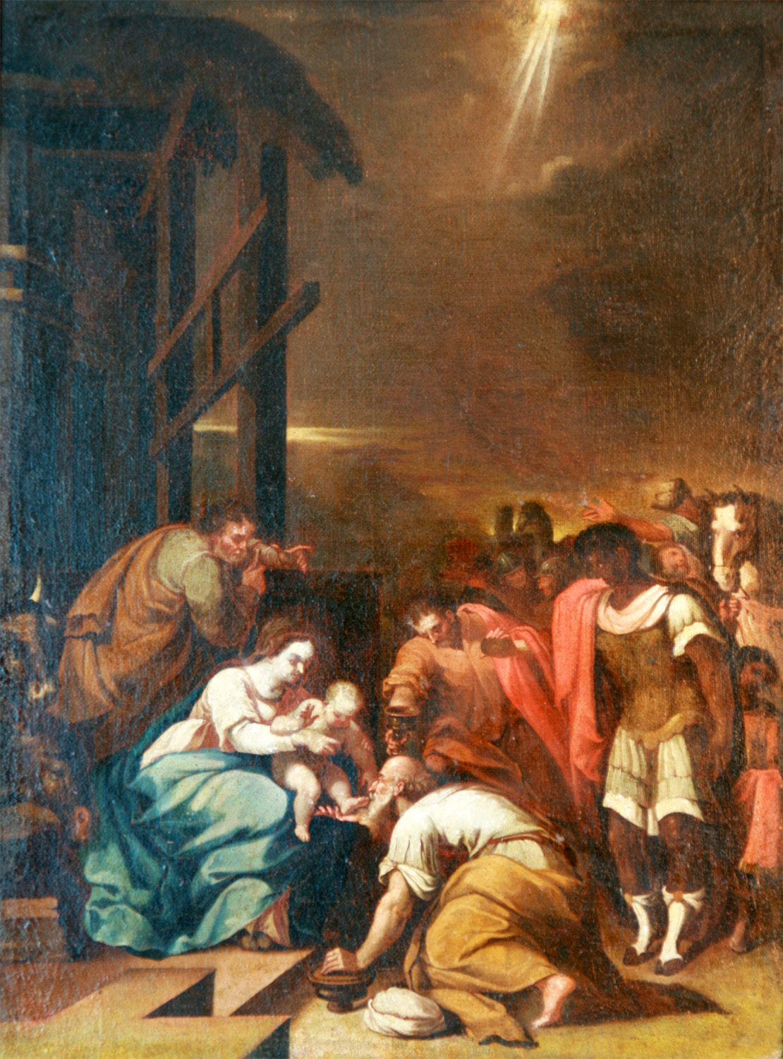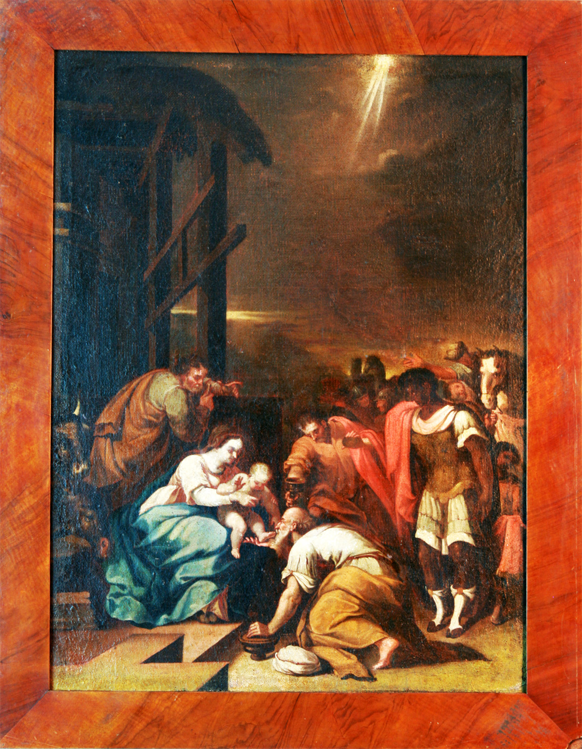 La obra representa el episodio evangélico de la Adoración de los Reyes Magos, uno de los temas más reiterados de la iconografía cristiana, especialmente vinculado a la Epifanía. En el contexto del siglo XVIII, este asunto se interpreta desde los presupuestos estéticos del Barroco tardío o el Rococó, con una clara tendencia a la teatralidad, la riqueza cromática y el énfasis emocional. La composición suele organizarse en torno a un eje central ocupado por la Virgen con el Niño, que actúan como foco visual y teológico de la escena. María aparece sentada o ligeramente elevada, sosteniendo al Niño Jesús, quien bendice o recibe los dones. Los Reyes Magos se disponen en semicírculo o en diagonal ascendente, creando dinamismo y profundidad espacial. Es habitual que Melchor, el rey anciano, se arrodille en primer plano ofreciendo el oro, gesto que subraya la humildad ante la divinidad. En el tratamiento formal, la pintura del siglo XVIII se caracteriza por una pincelada más suelta y una iluminación envolvente. La luz, de origen sobrenatural que dirige la estrella hacia el conjunto de personajes, de forma especial sobre el Niño y los rostros principales, dejando el resto en una penumbra cálida. El color adquiere especial protagonismo, con rojos, azules y dorados intensos, asociados tanto al lujo oriental como al simbolismo sacro. Los tejidos son tratados con gran virtuosismo técnico, destacando brocados y sedas que refuerzan el carácter ceremonial de la escena. Desde una perspectiva iconológica, la escena no solo narra un episodio bíblico, sino que transmite un mensaje de exaltación del poder divino y, en muchos casos, una lectura política implícita: los reyes de la Tierra se someten al verdadero Rey. En el siglo XVIII, esta imagen puede entenderse también como una reafirmación del orden religioso tradicional frente a los cambios ideológicos que anuncian la Ilustración.