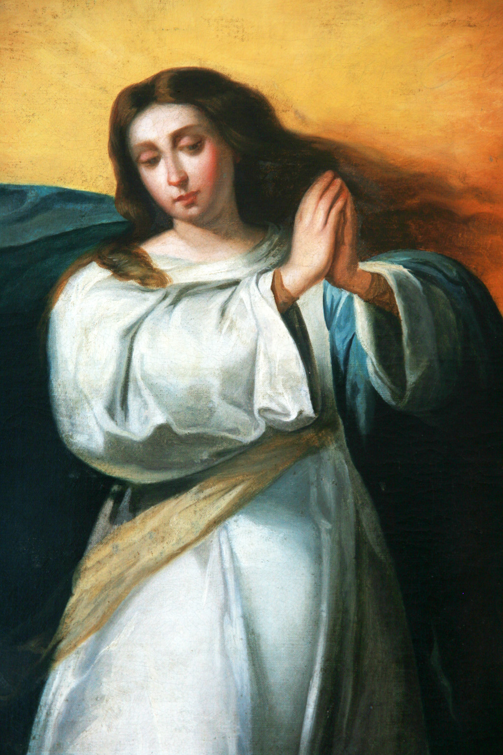 La obra representa a la Inmaculada Concepción, uno de los temas más característicos del barroco sevillano y especialmente de la escuela de Bartolomé Esteban Murillo. La Virgen aparece como una joven de gran belleza idealizada, con rostro dulce y expresión serena, que transmite pureza y espiritualidad. Su figura se eleva sobre un fondo celestial encima de la bola que representa el mundo junto a unas nubes de querubines reforzando el carácter celestial de la escena. María viste túnica blanca, símbolo de su pureza, y manto azul, color tradicionalmente asociado a la verdad y a lo divino. Su postura es grácil y dinámica, con las manos juntas y la mirada dirigida hacia el grupo de ángeles, gesto que expresa humildad y aceptación del designio divino. Desde el punto de vista técnico, la obra presenta un dibujo suave y un modelado delicado, característico del estilo murillesco. Predominan los colores claros y luminosos, con una iluminación difusa que envuelve la figura y elimina los contrastes violentos del tenebrismo barroco. Las pinceladas son fluidas y contribuyen a crear una atmósfera vaporosa y espiritual.En conjunto, esta Inmaculada refleja el ideal religioso y estético de la escuela sevillana marcada por una profunda devoción mariana. La escuela de Murillo supo transmitir, a través de variadas imágenes sobre la Virgen, un mensaje cercano y emotivo, haciendo accesible el dogma de la Inmaculada al fiel común mediante una representación amable, luminosa y profundamente devocional.