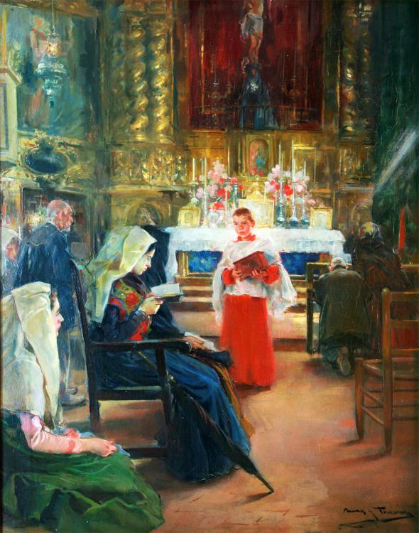 Se trata de una escena en la capilla de Santa Maria del Pi de Barcelona. En el reverso fotografía de la mencionada capilla.