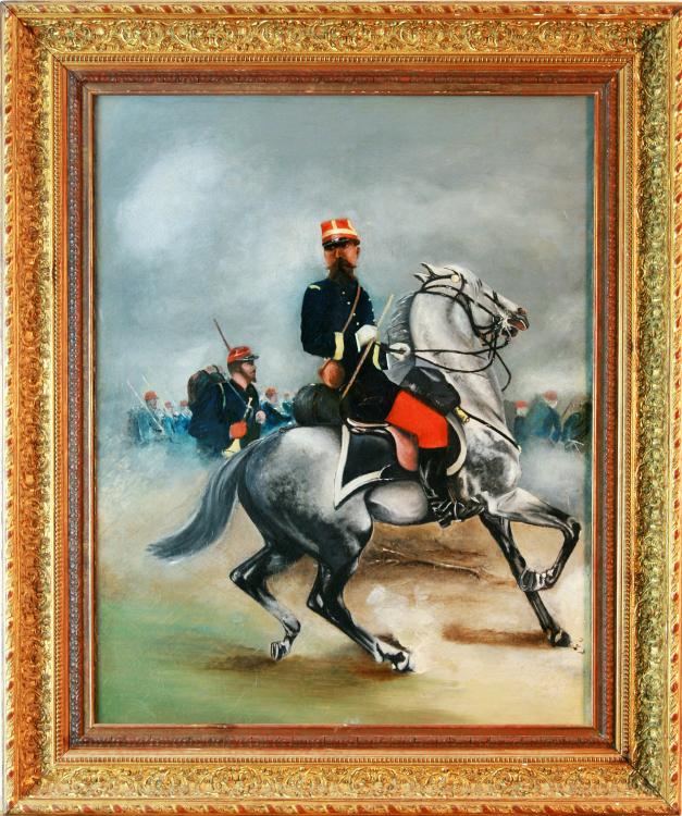 Esta obra captura la figura de un oficial de caballería montado en un caballo en movimiento, un tema que evoca la nobleza y el heroísmo asociados con la vida militar. El din ...Ver más